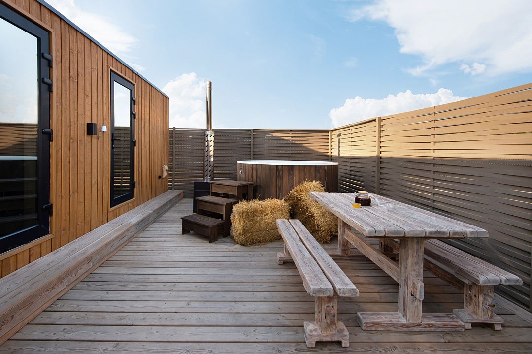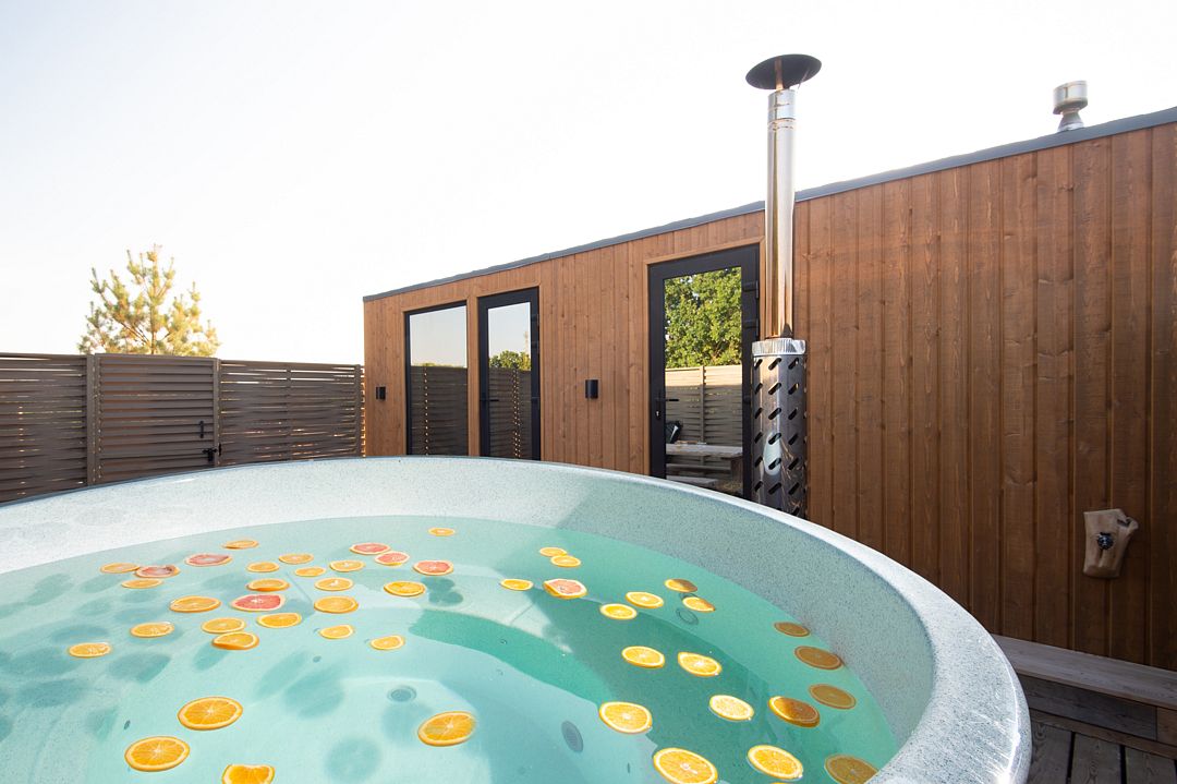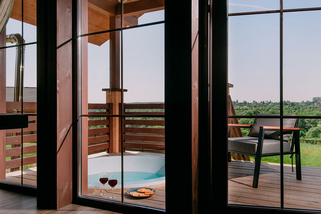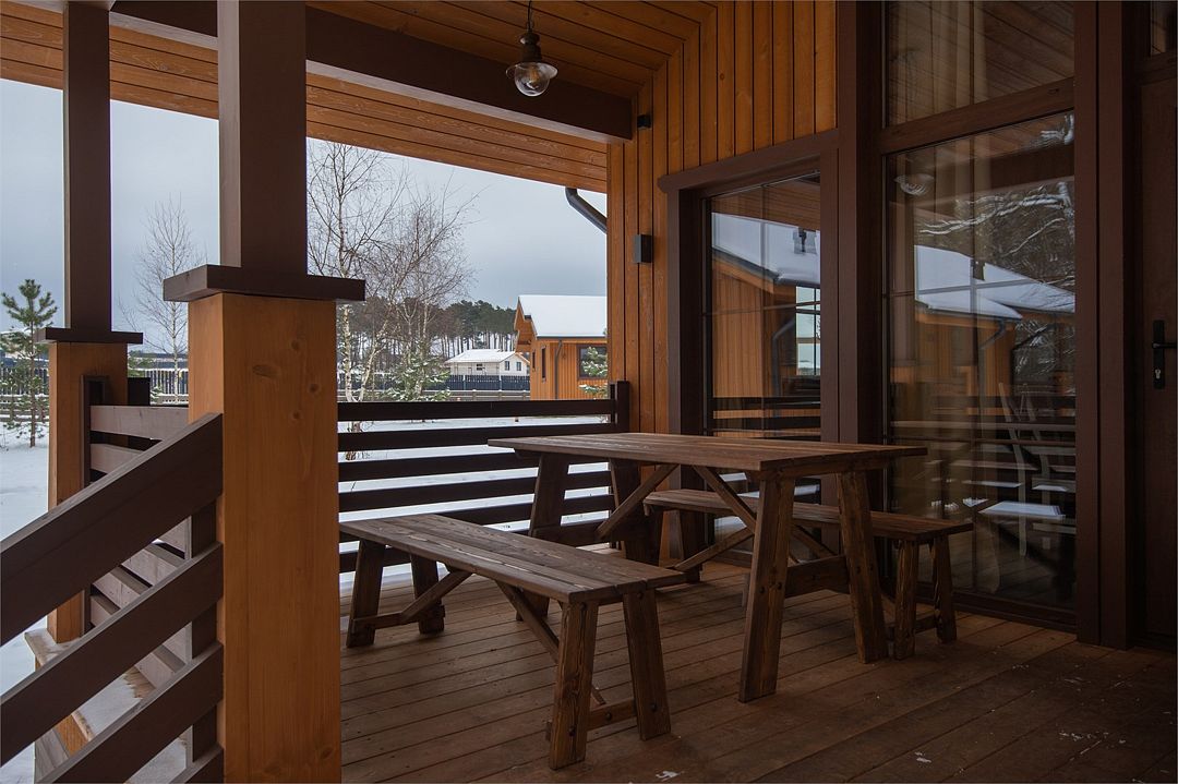 Дом располагает террасой с мягкой мебелью и подогреваемой индивидуальной купелью, мангальной зоной и панорамными окнами.
