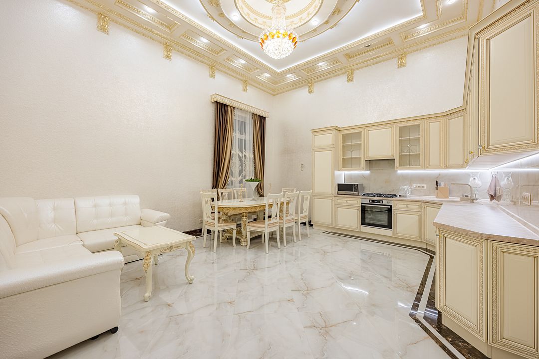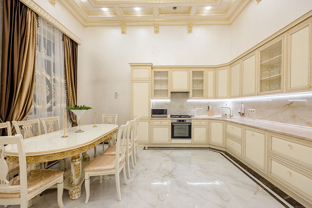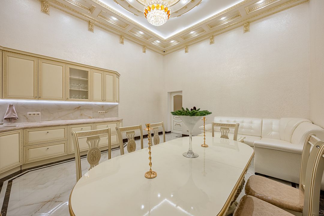 Большая кухня с необходимыми кухонными принадлежностями. Просторная и светлая гостиная оснащена двумя стеклянными столами ручной работы, за которыми вы сможете провести торжественный банкет.