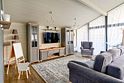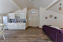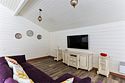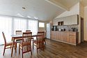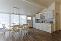В доме большая гостиная с кухней, где есть вся необходимая посуда, кастрюли, сковородки, столовые приборы, тарелки, стаканы, бокалы, кофейный набор, микроволновая печь, холодильник, тостер, плита, посудомоечная машина, большой обеденный стол со стульями, удобная зона отдыха перед большим телевизором. Большой диван и кресло.