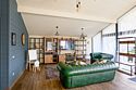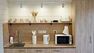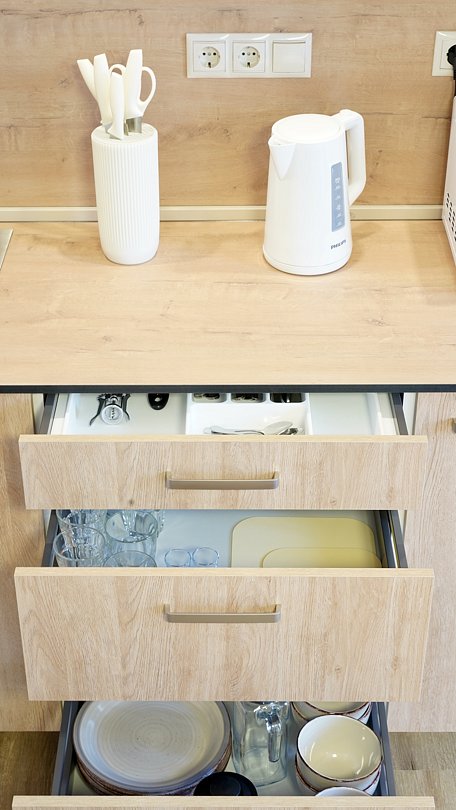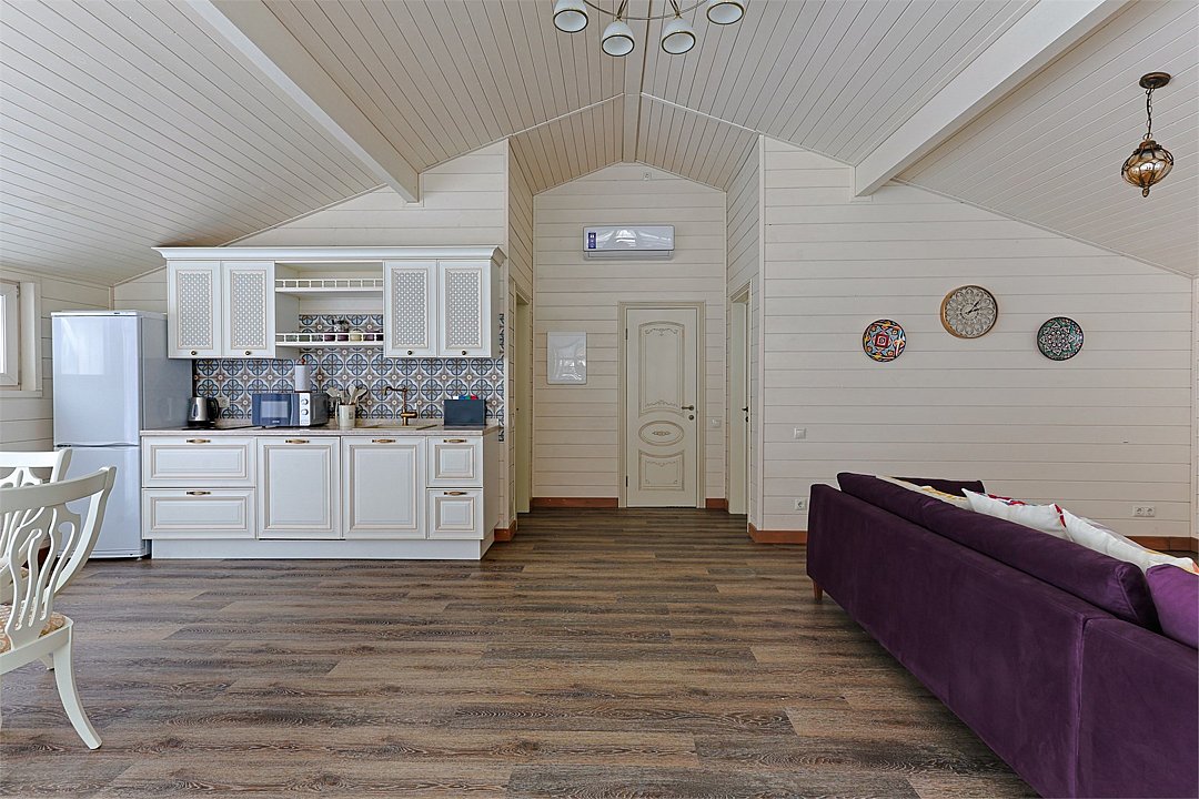 В доме большая гостиная с кухней, где есть вся необходимая посуда, столовые приборы, кастрюли, сковородки, бокалы, кофейный набор, рюмки, микроволновая печь, холодильник, тостер, плита, посудомоечная машина, большой обеденный стол со стульями, удобная зона отдыха перед большим телевизором. Диван и кресло.