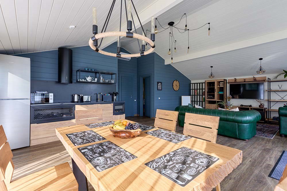 В доме большая гостиная с полноценной кухней, где есть вся необходимая посуда, столовые приборы, бокалы, тарелки, кофейный набор, кастрюли и сковородки, микроволновая печь, холодильник, тостер, плита, посудомоечная машина, большой обеденный стол со стульями, удобная зона отдыха перед большим телевизором, пледы.