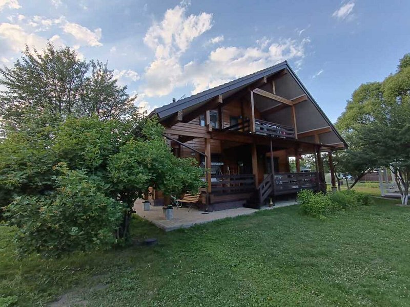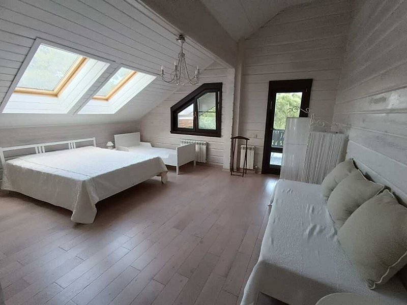 Двухэтажный дом общей площадью 230 кв.м и территорией 50 соток. В доме есть кухня-гостиная, 3 изолированные спальни. Санузлы и кухня с тёплыми полами, крытая терраса и балкон на втором этаже. В распоряжении гостей есть бытовая техника: индукционная плита, микроволновка, чайник, холодильник, стиральная машина и кабельное телевидение. Посуда для приготовления пищи, тарелки, бокалы, стаканы, столовые приборы. Постельное бельё и полотенца, гигиенические принадлежности. Игрушки и настольные игры. К услугам гостей: терраса для игр, футбольное поле с воротами и площадкой для волейбола, отдельная беседка для отдыха, турники, детская мебель, мангал и инвентарь для шашлыка.