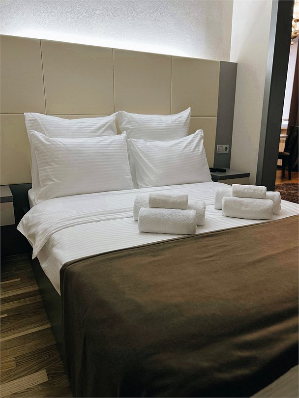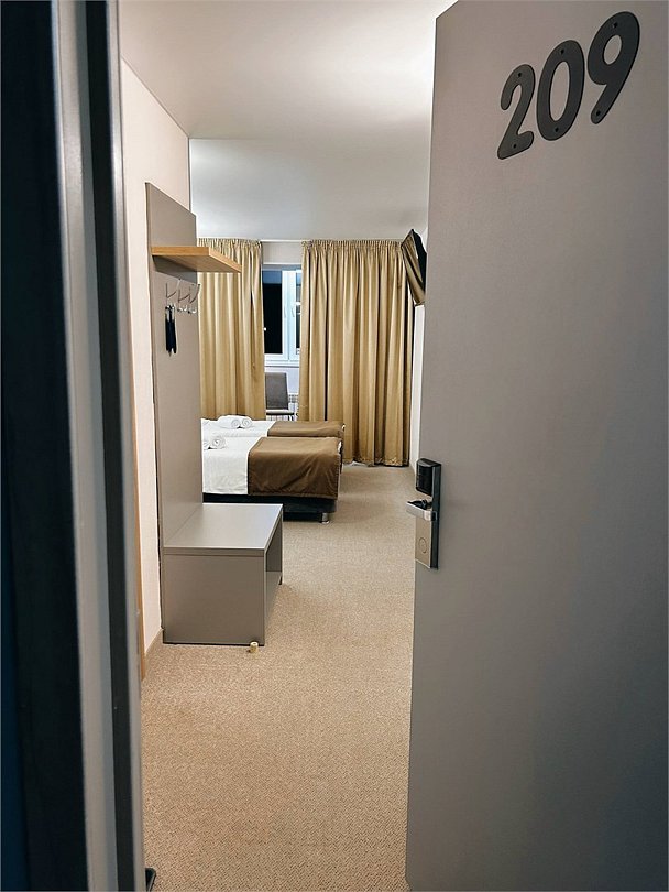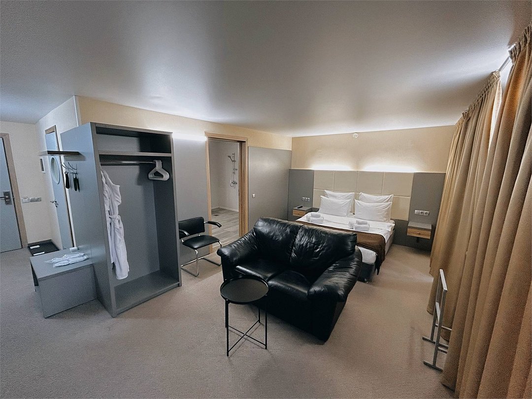 Номер просторный и чистый, есть рабочая зона. Больная кровать с хорошим матрасом. Чистый санузел. За номер твердая пятерка.