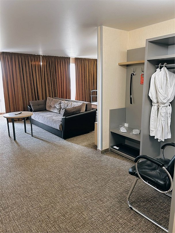 Номер Полулюкс в бизнес-отеле Воскресенск огромен. Его площадь 48 м2, на которых разместились кровать королевского размера, удобный диван для отдыха и большой телевизор. Конечно же, в номере санузел с большой ванной и удобные столики для чая и работы. В номере множество электрических розеток и быстрый интернет. При необходимости мы подготовим номер для новобрачных, украсим его и спланируем ужин и завтрак для молодоженов. Номер расположен на 4 этаже, подальше от лифта и других номеров.Услуги и удобства