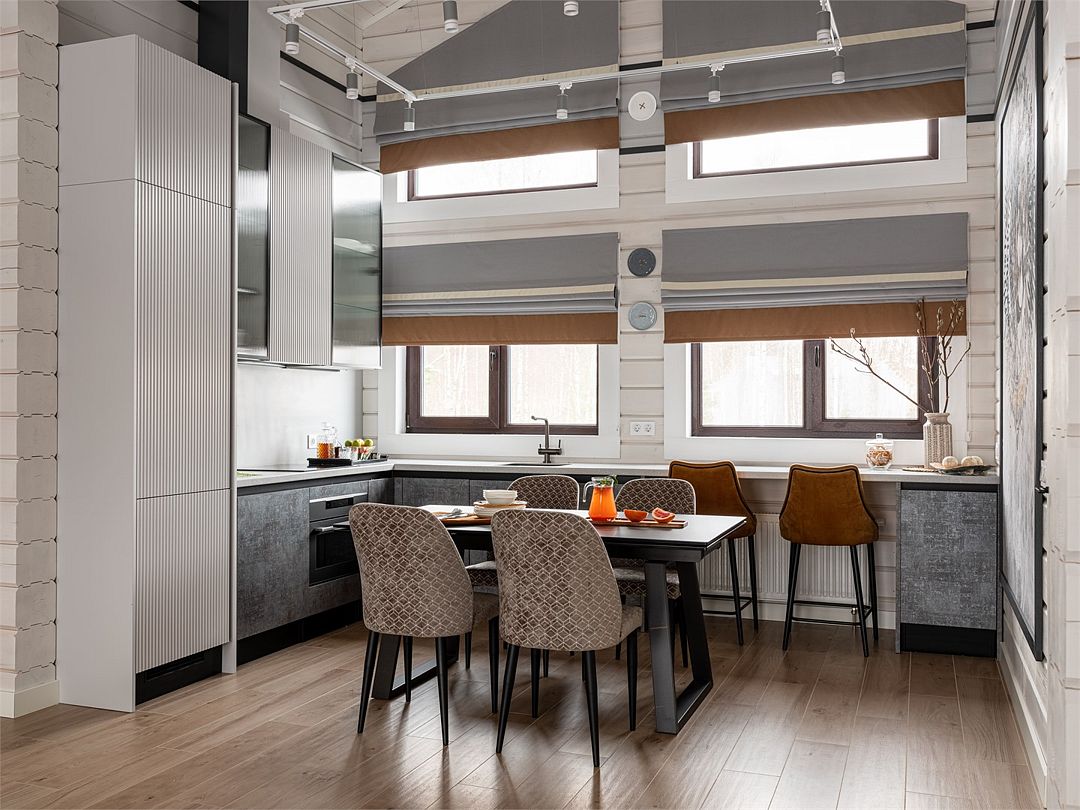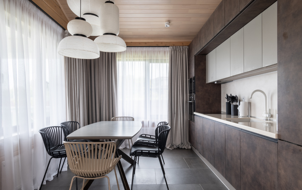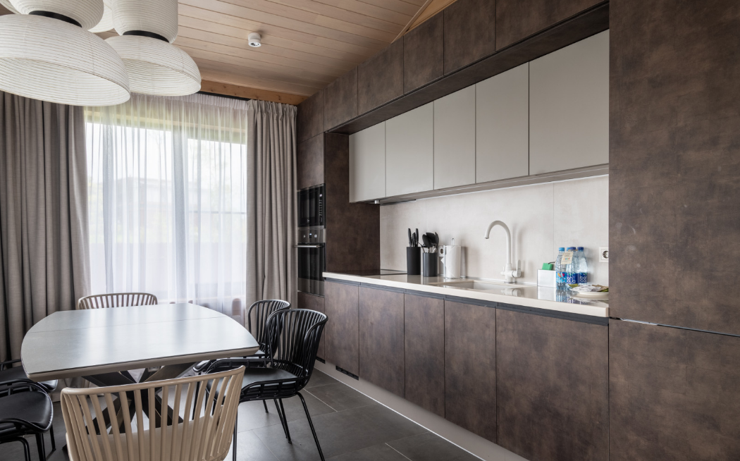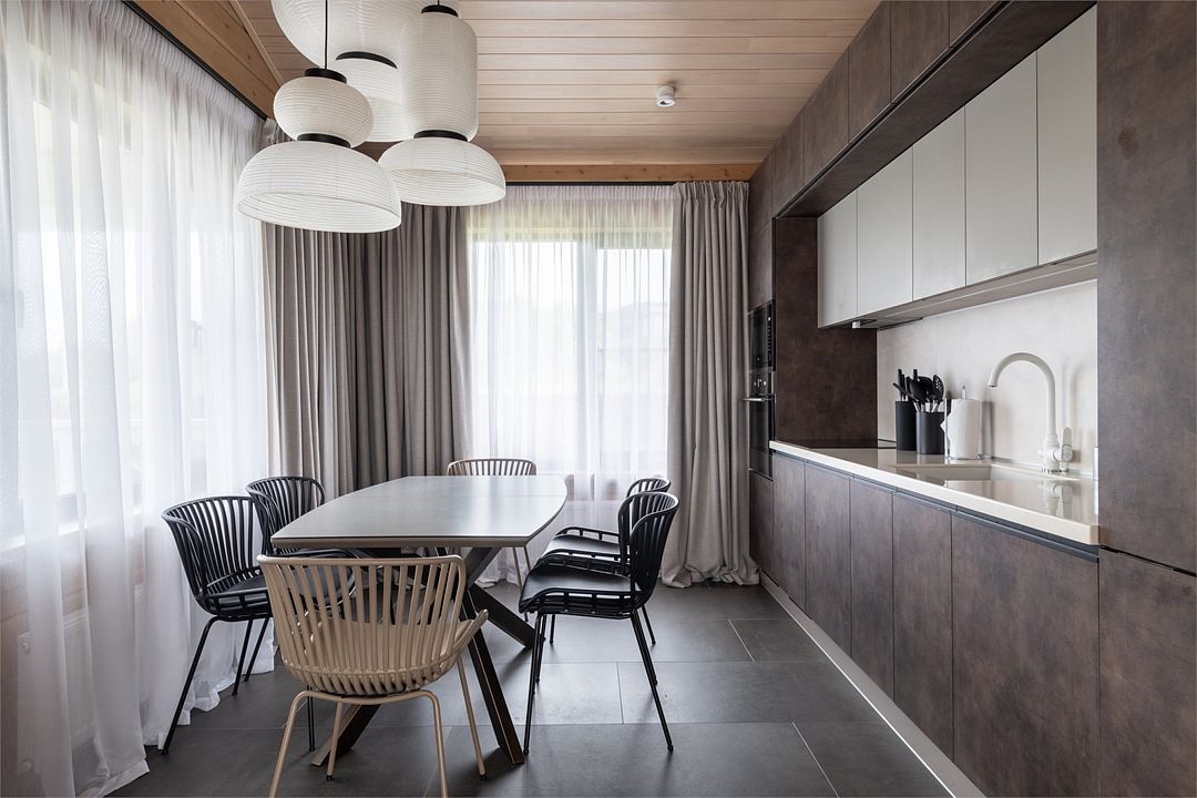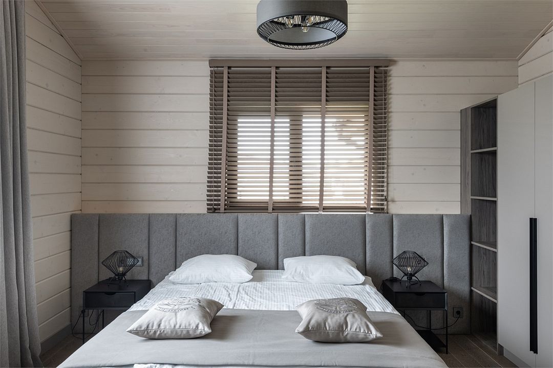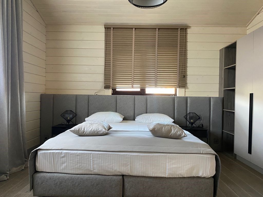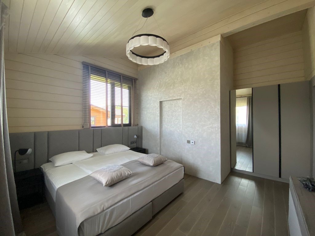 Коттедж площадью 94 кв.м с мебелью в темных тонах (2 спальни с кроватями Queen size, кухня, гостиная, прихожая, холл, санузел с душевой кабиной, туалетная комната, просторная терраса с садовой мебелью).
