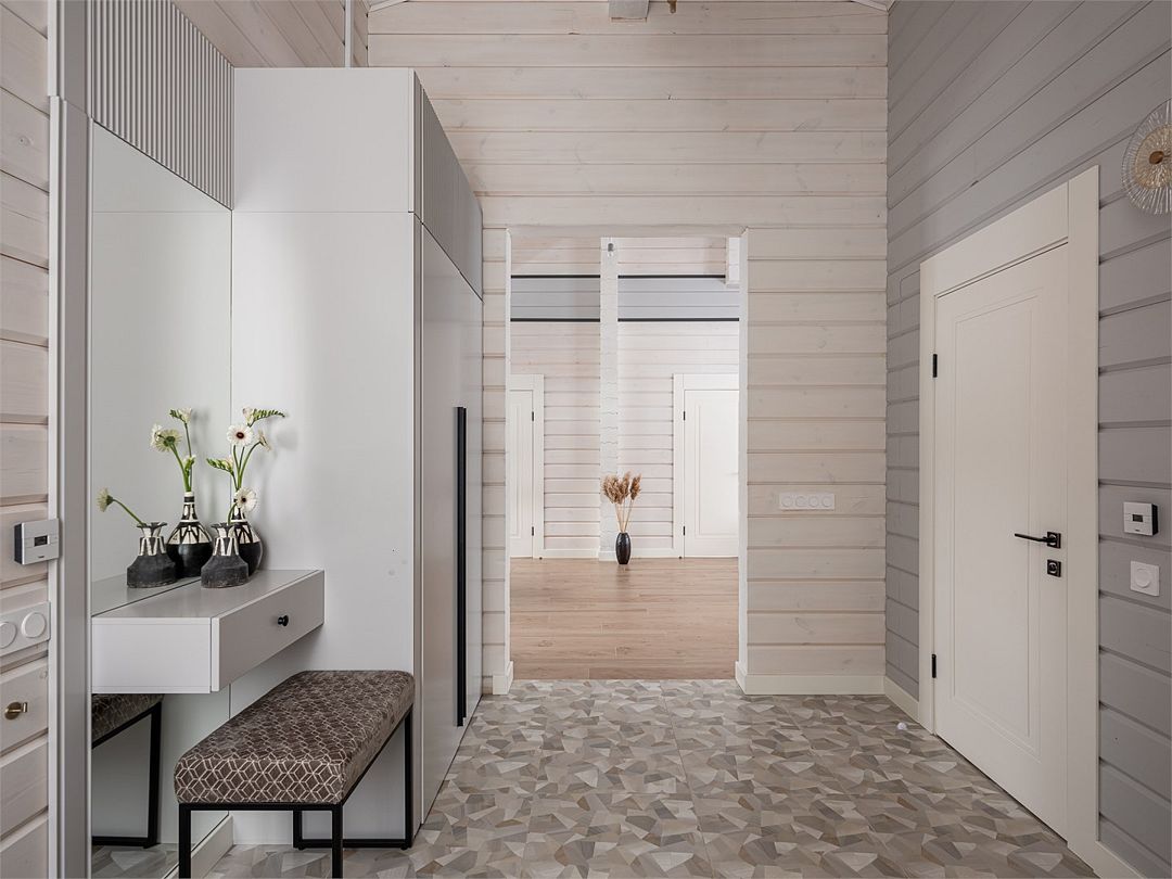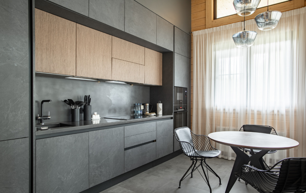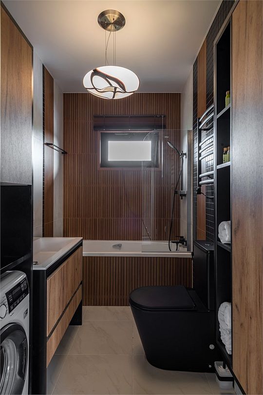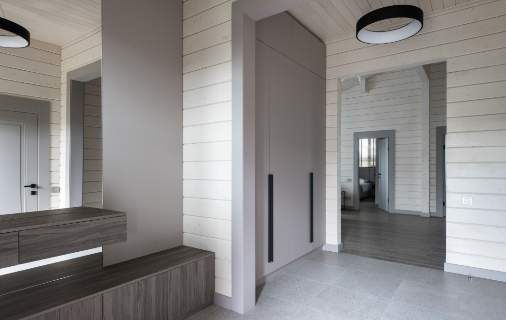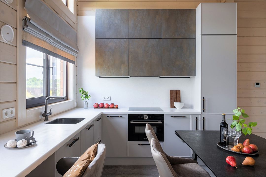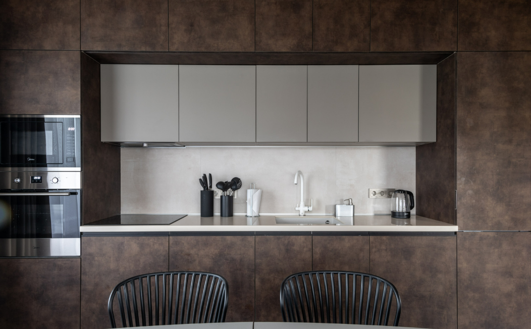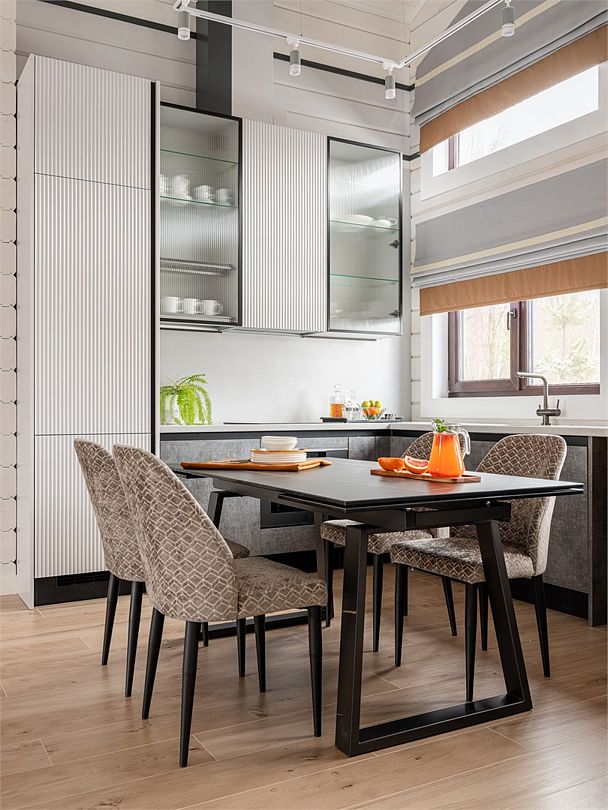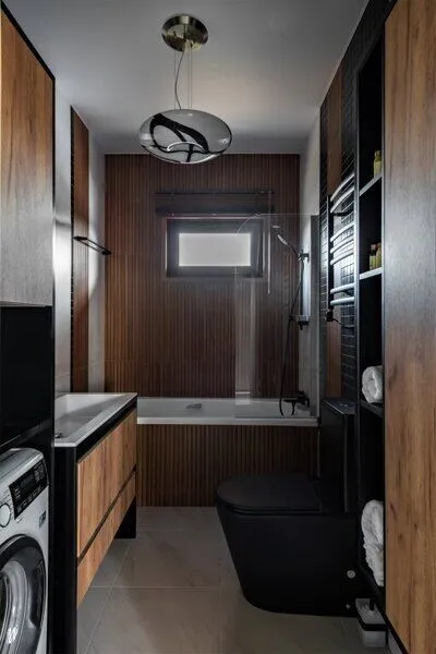 Коттедж площадью 94 кв.м с мебелью в темных тонах (2 спальни с кроватями Queen size, кухня, гостиная, прихожая, холл, санузел с душевой кабиной, туалетная комната, просторная терраса с садовой мебелью).