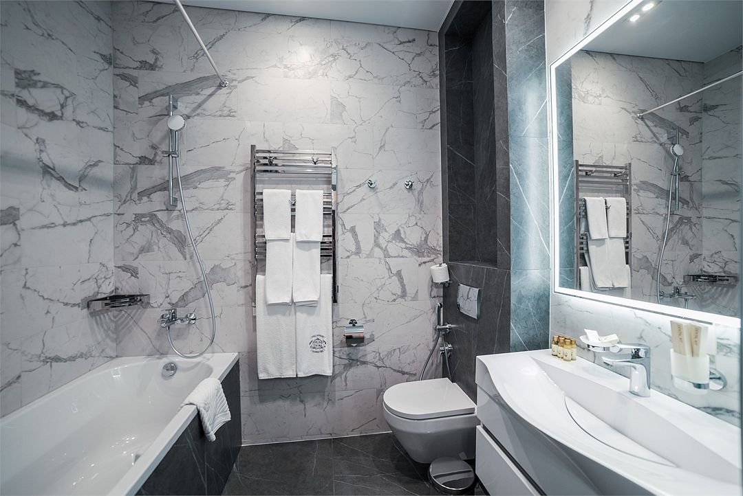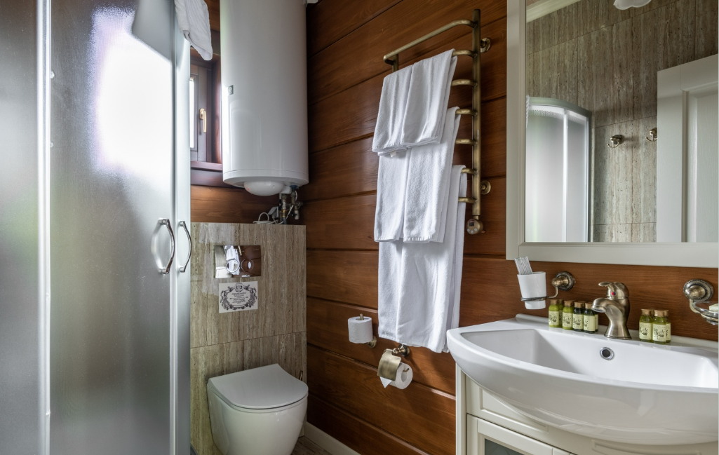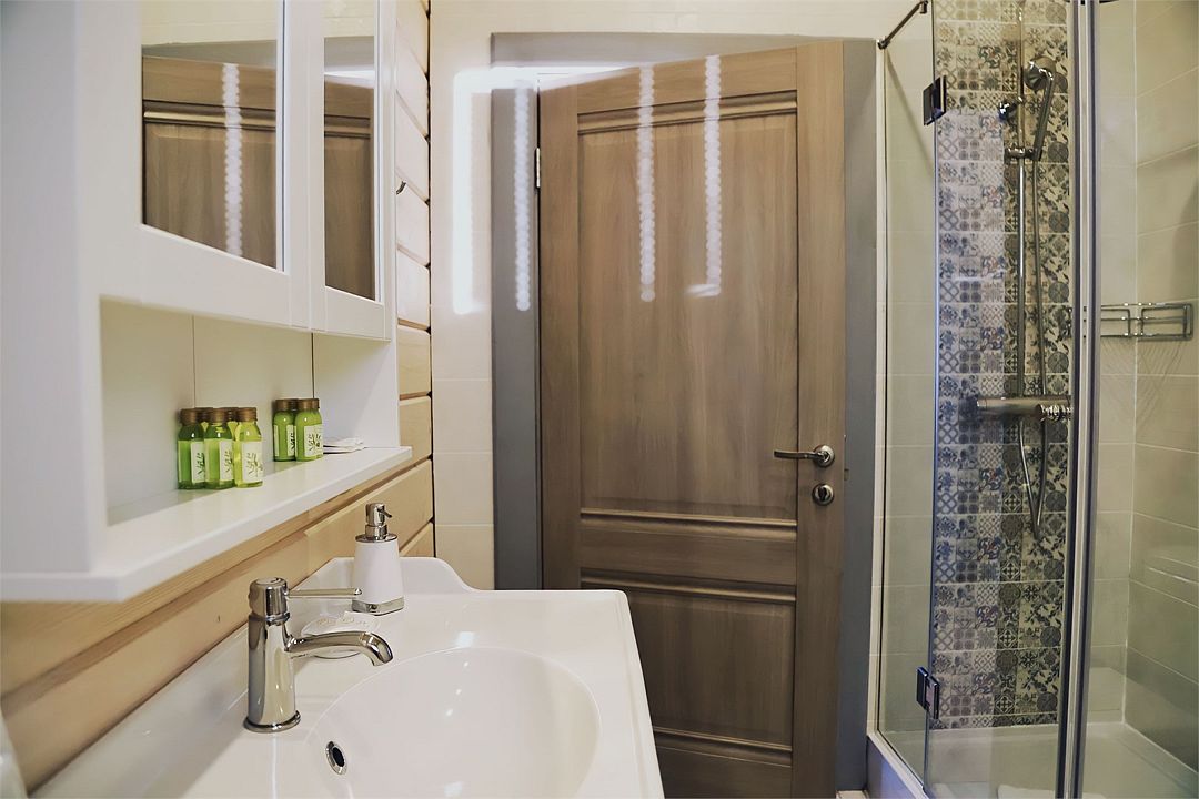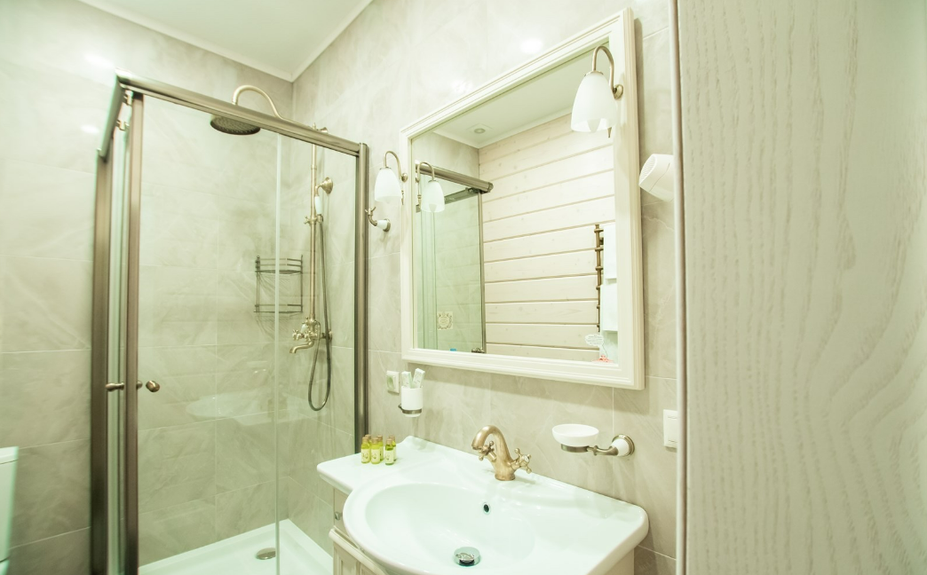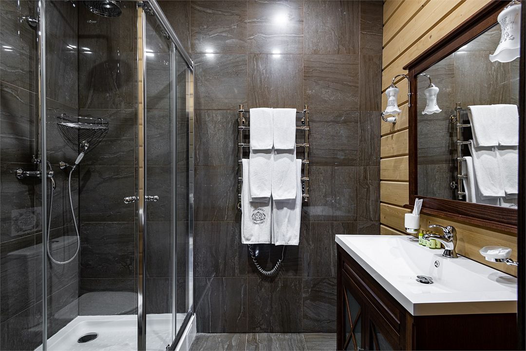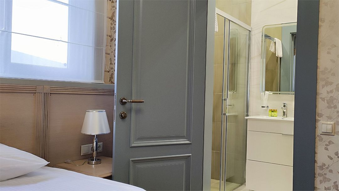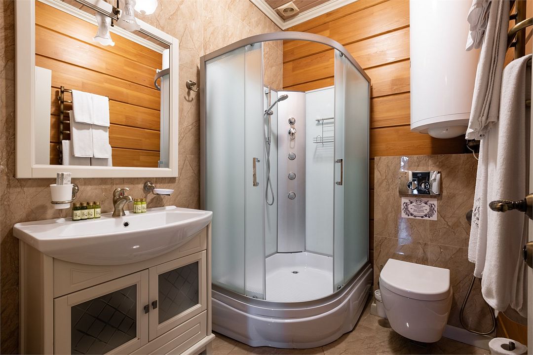 - два санузла с душевой кабиной (при наличии по запросу — номера с санузлом с полноценной ванной);