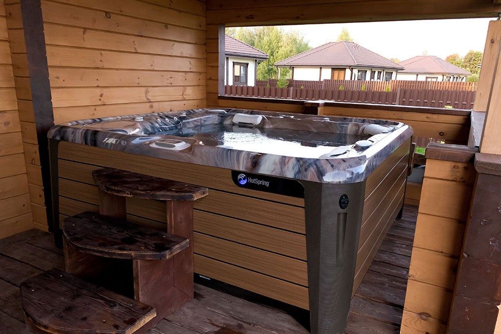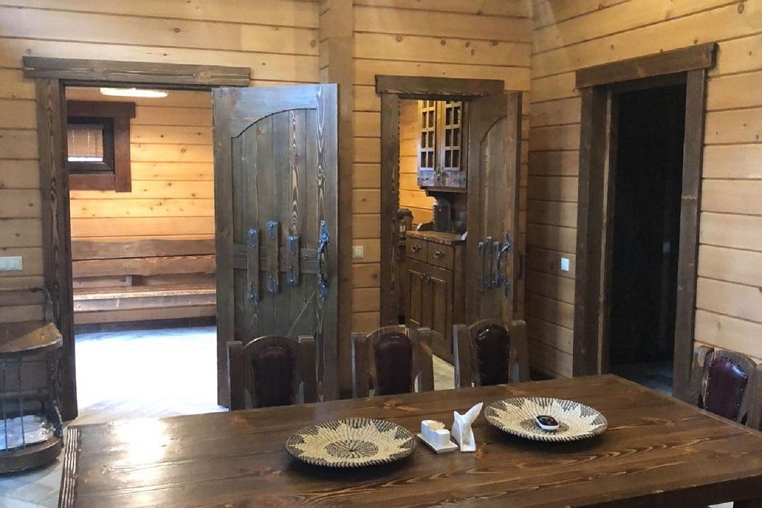 Планировка: спальня, гостиная, санузел, душевая, сауна. На улице — гидромассажная ванна, открытая терраса с садовой мебелью и мангал. Баню можно арендовать на несколько часов или снять на любой срок с проживанием. Работает доставка блюд из нашего ресторана.