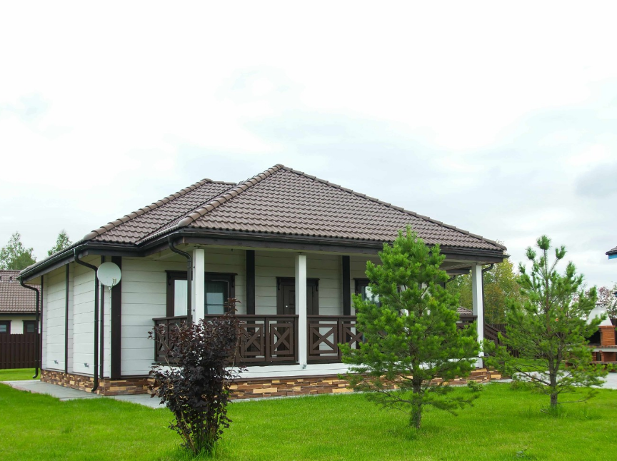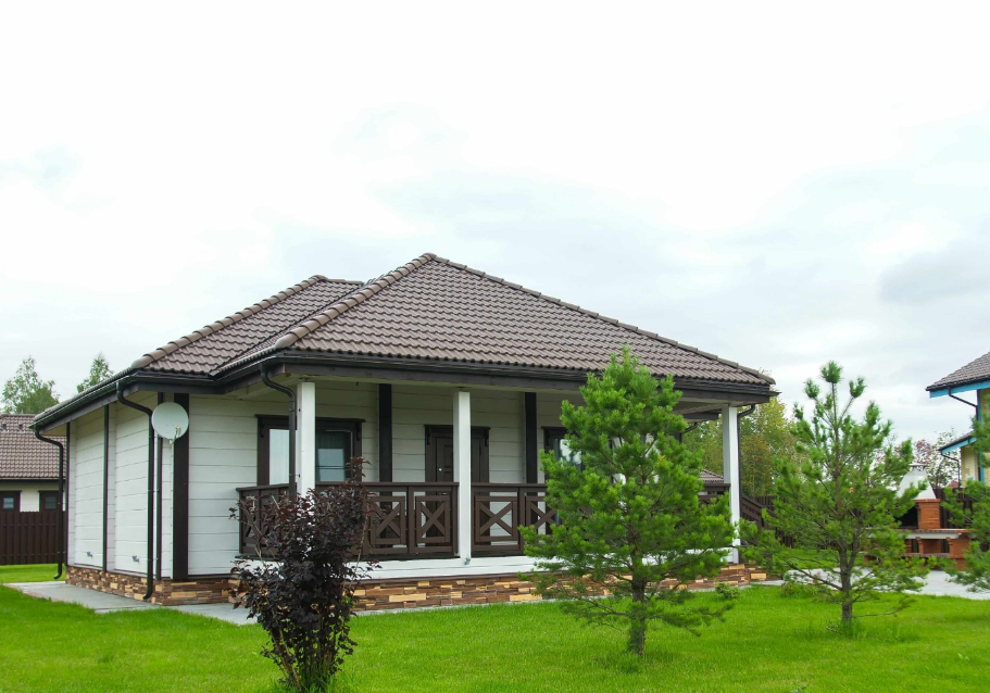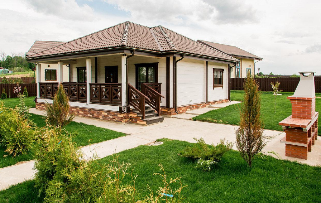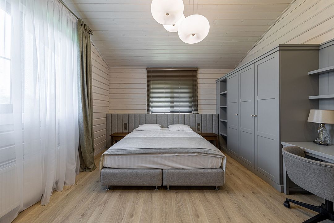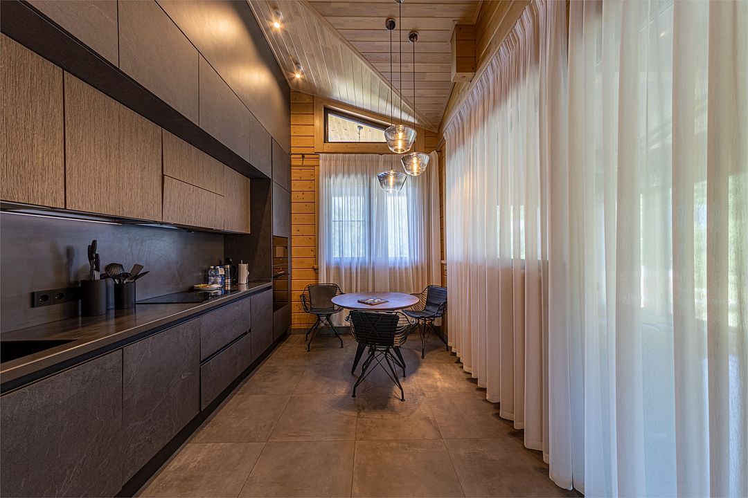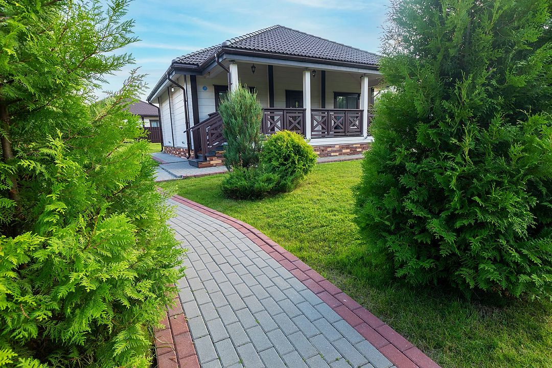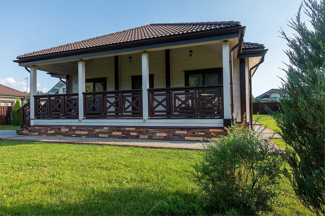 Коттедж площадью 94 кв.м с мебелью в темных тонах (2 спальни с двуспальными кроватями, кухня, гостиная, прихожая, холл, санузел с душевой кабиной, туалетная комната, просторная терраса с садовой мебелью).