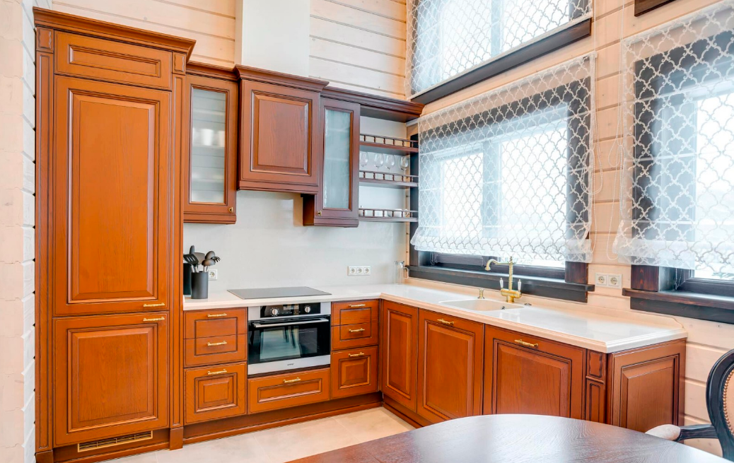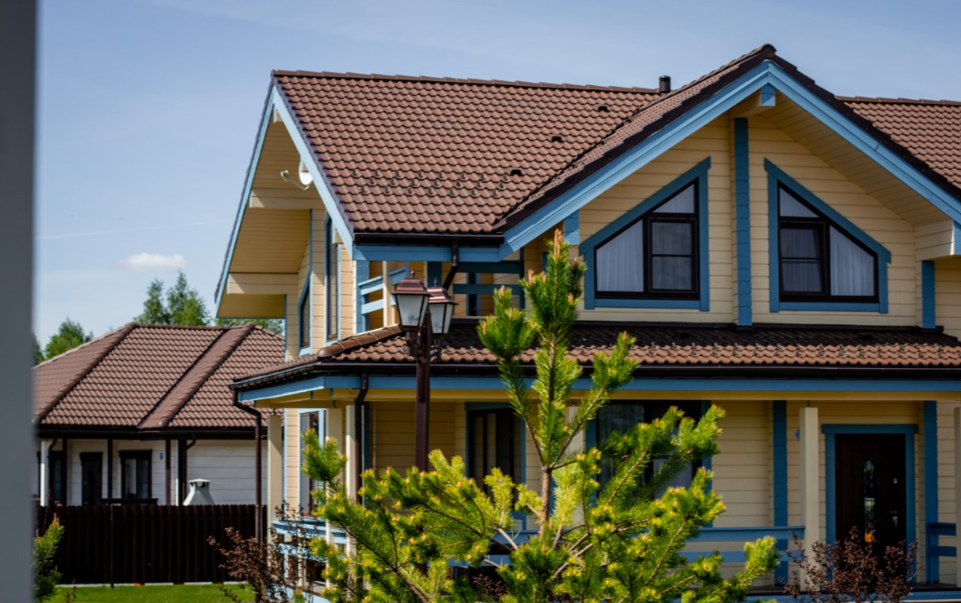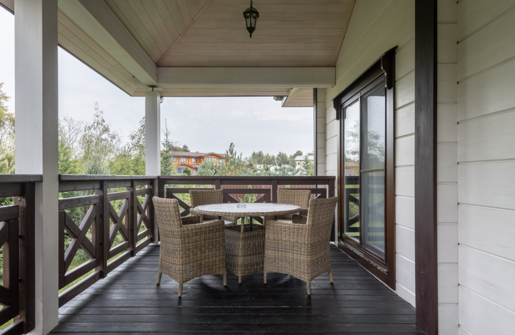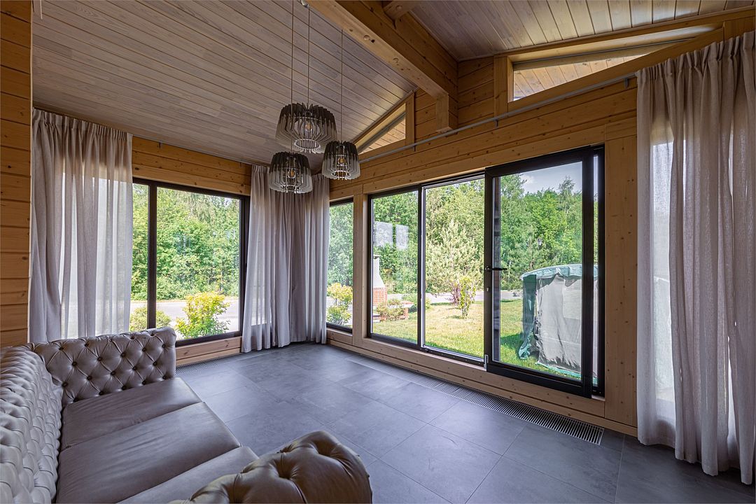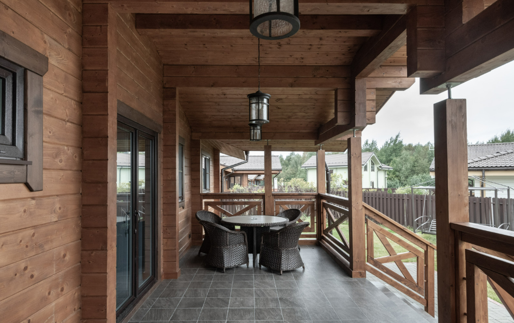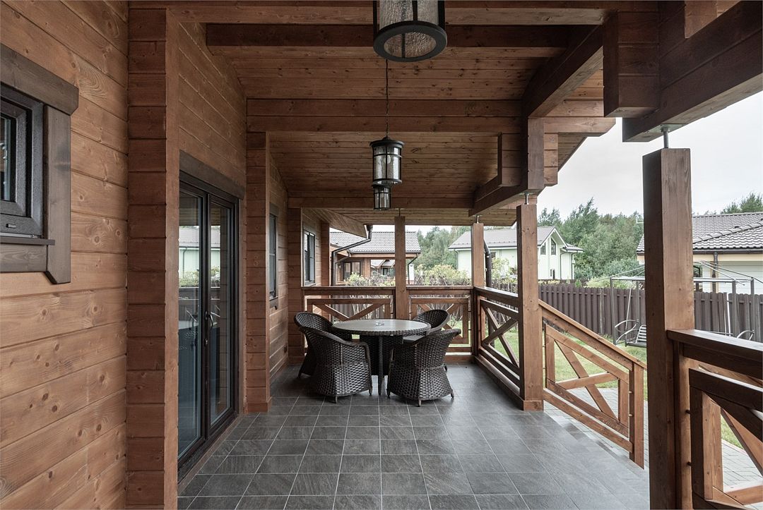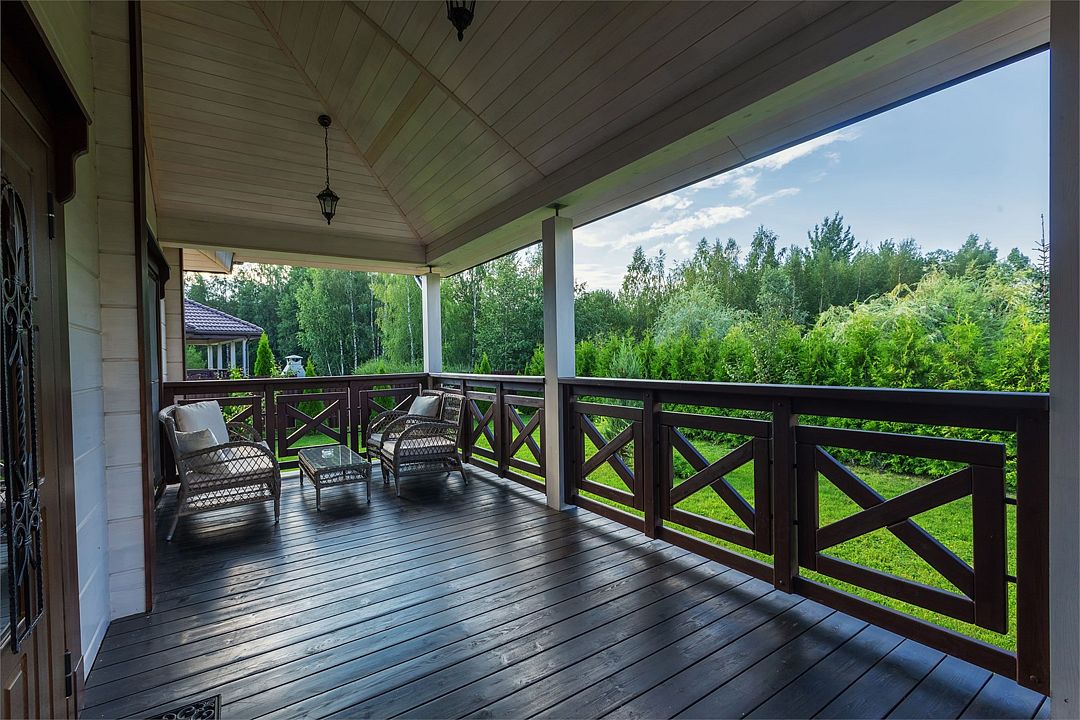 Коттедж площадью 94 кв.м с мебелью в темных тонах (2 спальни с двуспальными кроватями, кухня, гостиная, прихожая, холл, санузел с душевой кабиной, туалетная комната, просторная терраса с садовой мебелью).