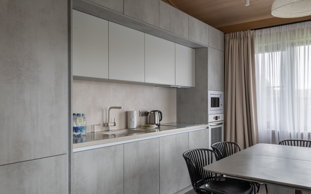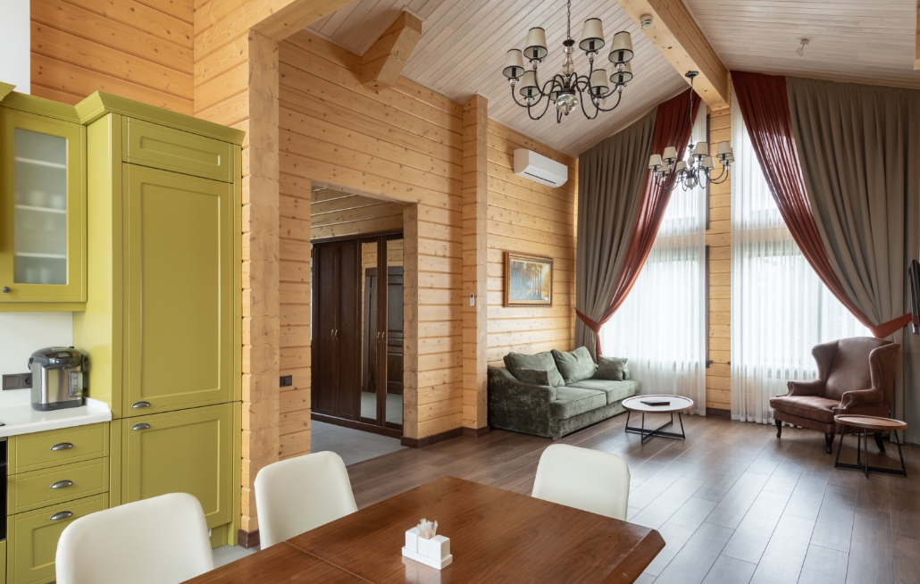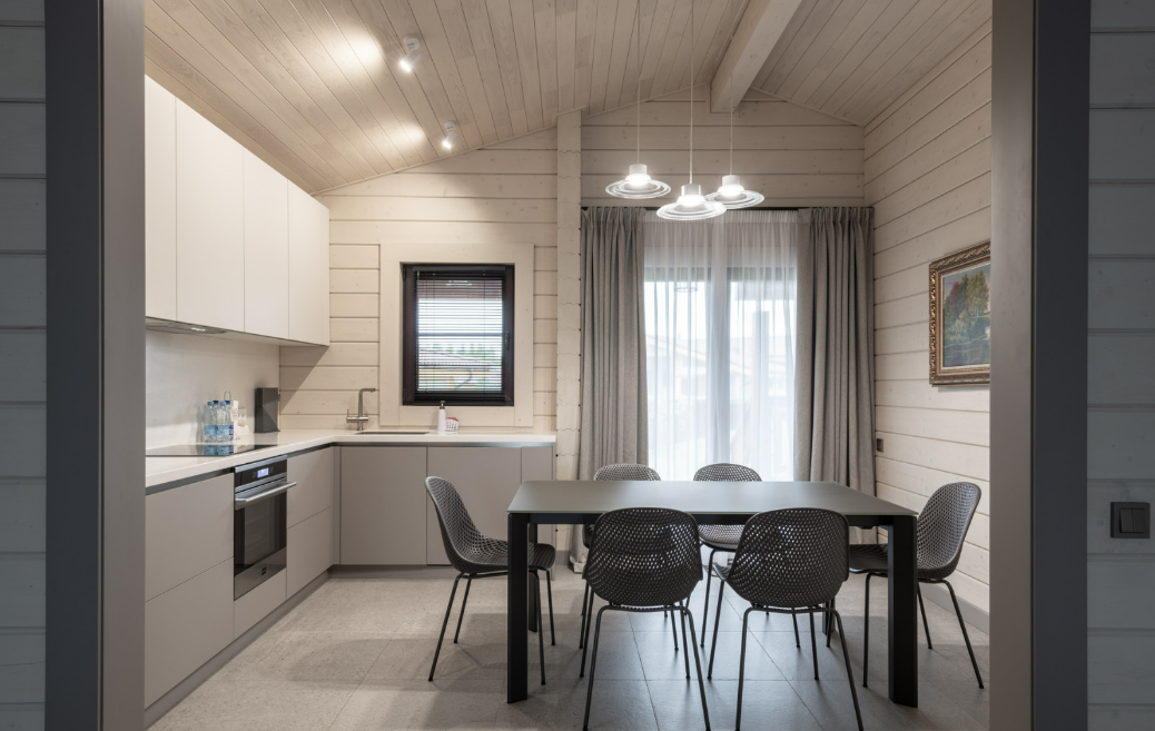 Шале с кухней 80 кв.м (дуплекс) - двухкомнатный номер с кондиционером (гостиная с мини-кухней и 1 спальня) с отдельным входом с улицы. Шале рассчитано для комфортного размещения 2-х человек. Дополнительные гости могут разместиться на раскладном диване в гостиной, имеется возможность установки дополнительного места (просим обратить внимание на стоимость при размещении гостей на диване и дополнительных местах).