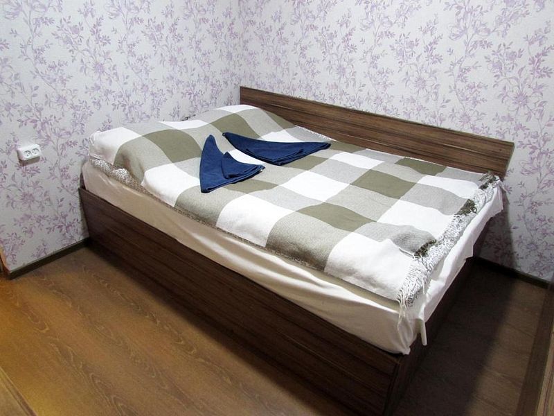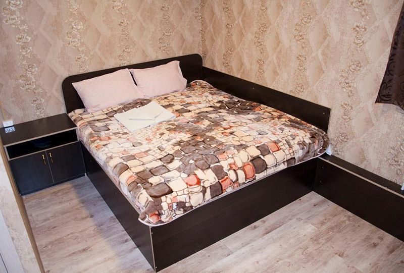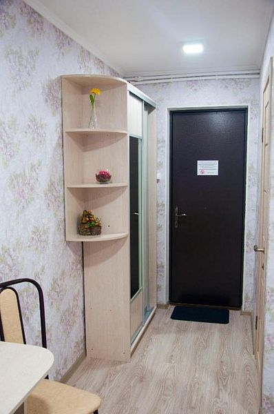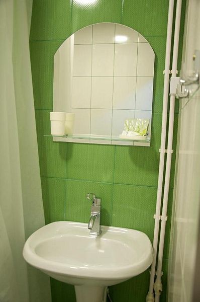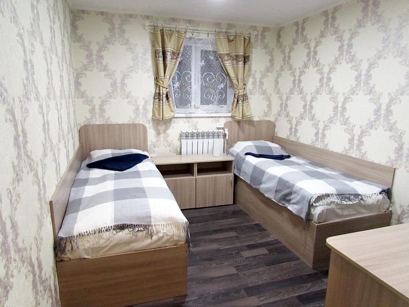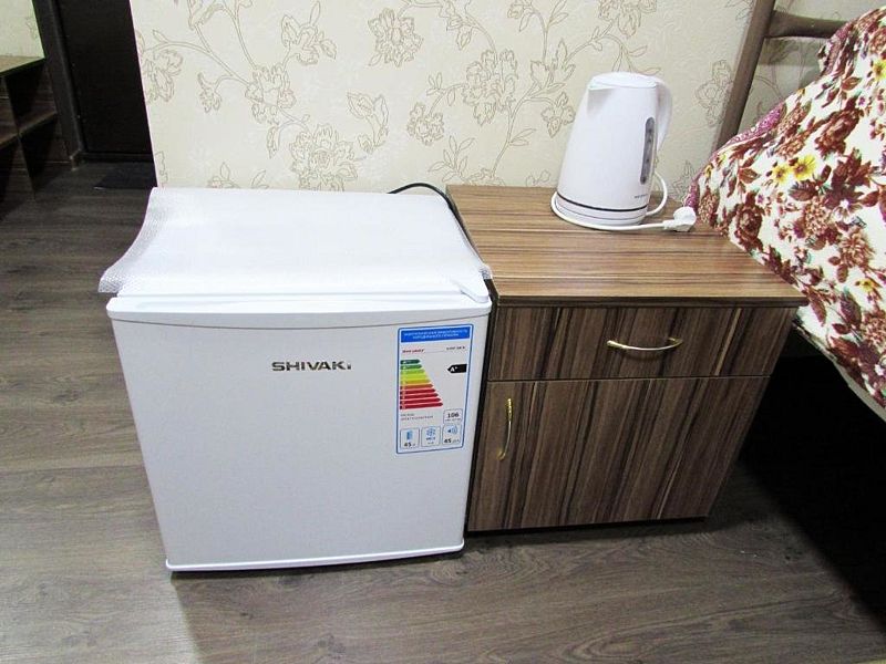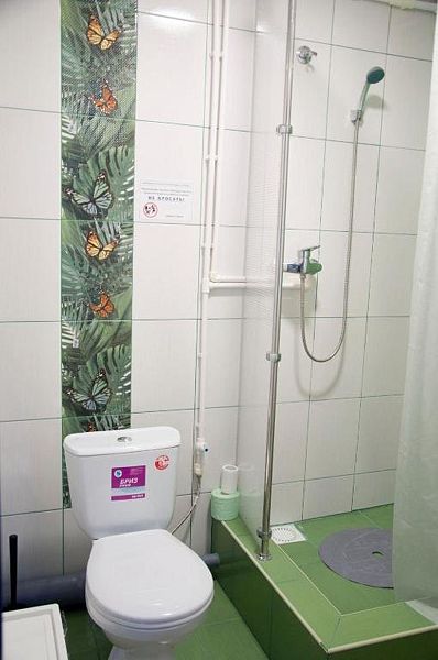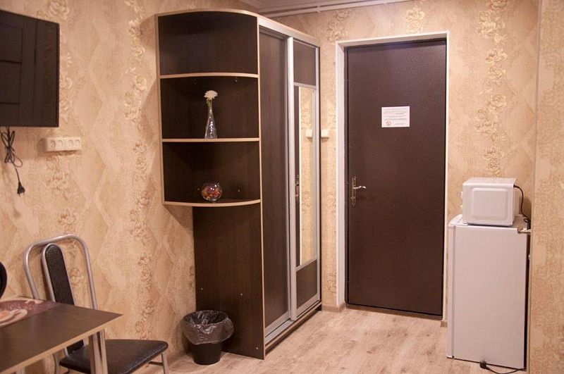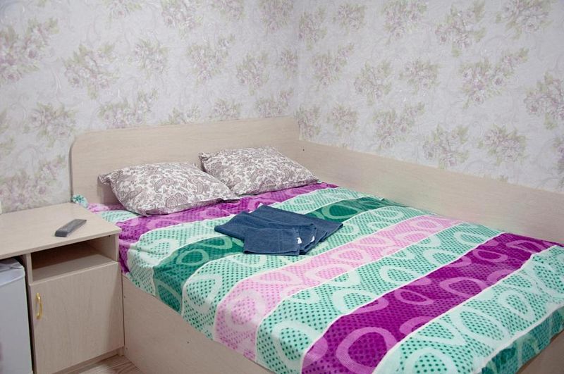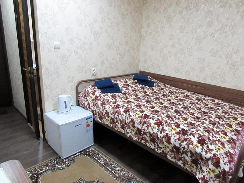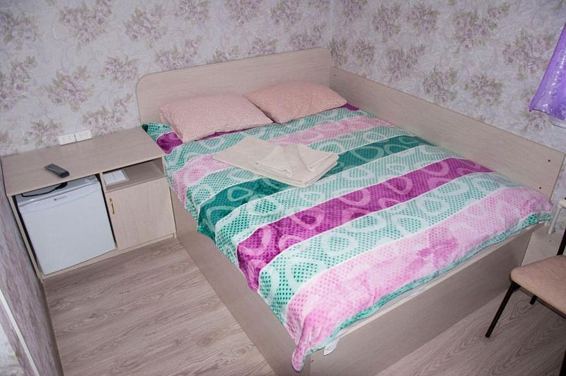 Небольшая комната со всеми удобствами. Душ, туалет, раковина, телевизор, стол, табуретки, холодильник, постельное белье и полотенца, душевая косметика.
