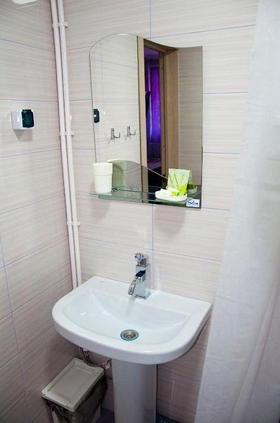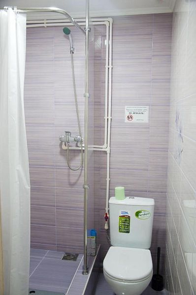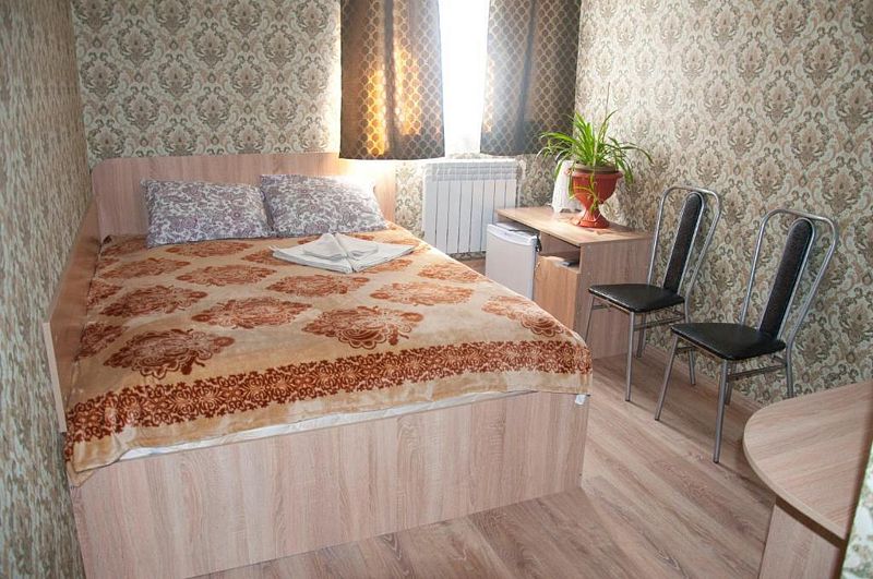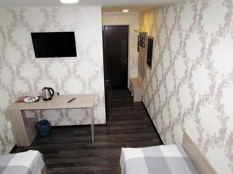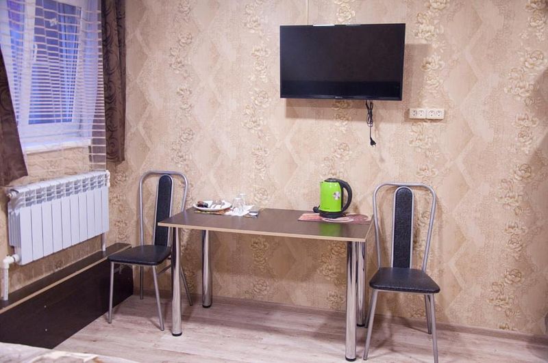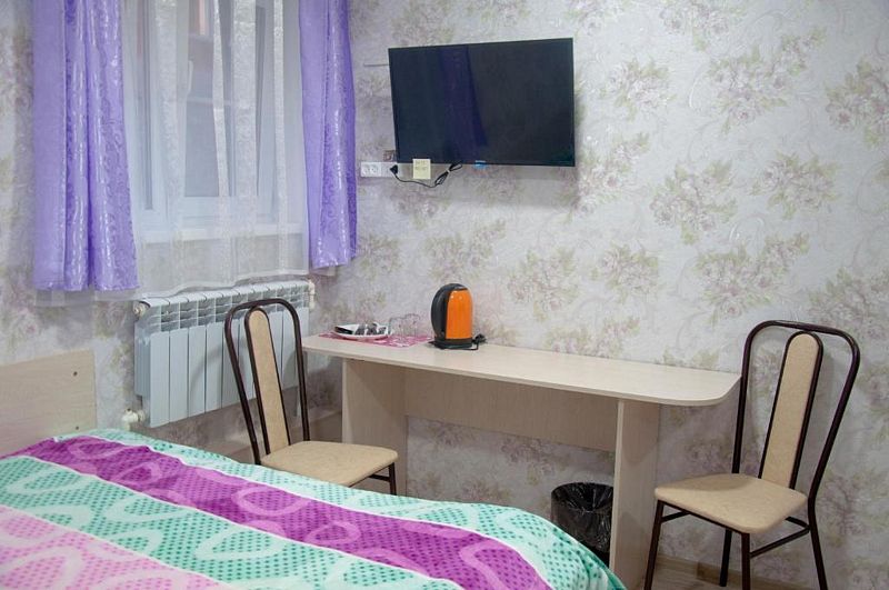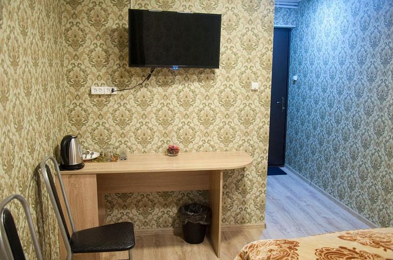 Номер со всеми удобствами. Душ, туалет, раковина, телевизор, стол, табуретки, холодильник, постельное белье и полотенца, душевая косметика.