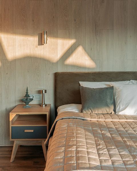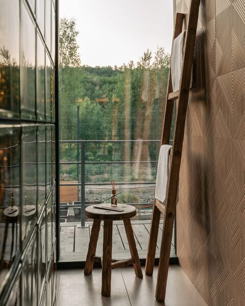 Кровать king size 180/200, мини бар, кондиционер, собственная терраса и выход к реке, панорамные окна и дополнительные спальные места.