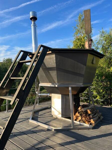 Отдых в банном чане можно назвать чудодейственным: горячая вода прогревает тело медленнее и глубже, чем горячий сухой пар, и все это в окружении леса, с энергией открытого огня и свежего воздуха.