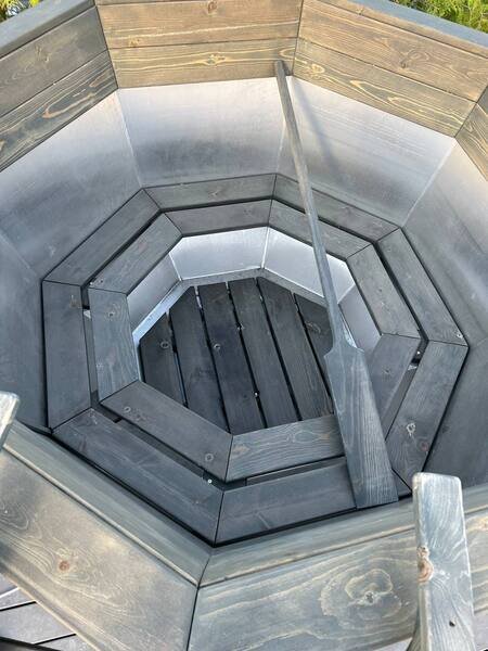 Снизу расположена дровяная печь — вода в чане разогревается примерно до 37-42 градусов.