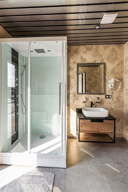 Номер оснащен всем необходимым для комфортного проживания. Современная ванная комната оборудована душевой кабиной, полотенцесушителем, зеркалом с подсветкой, а также косметическим зеркалом и феном. Мягкие халаты и полотенца, тапочки, банные и косметические принадлежности.