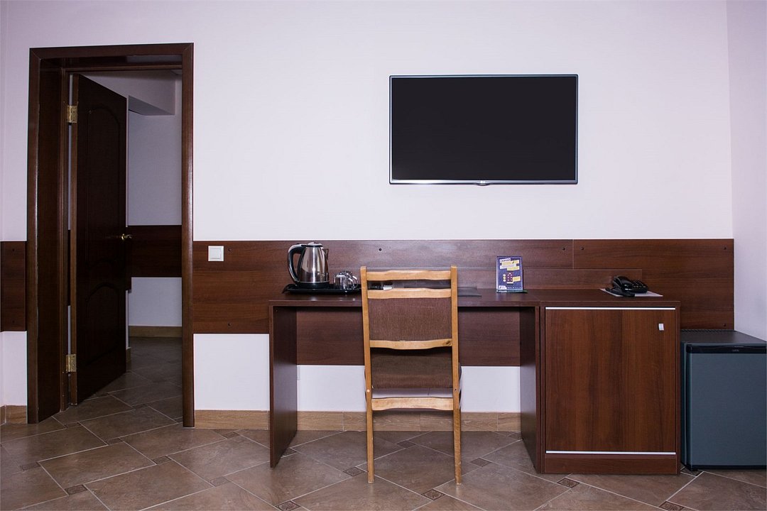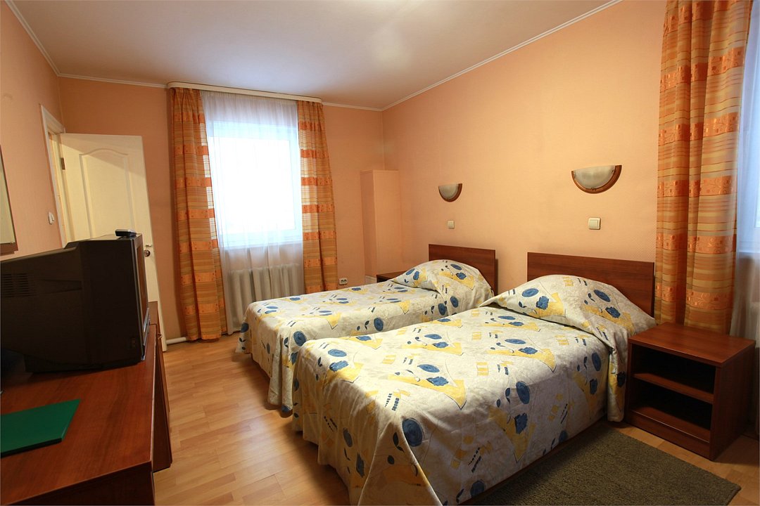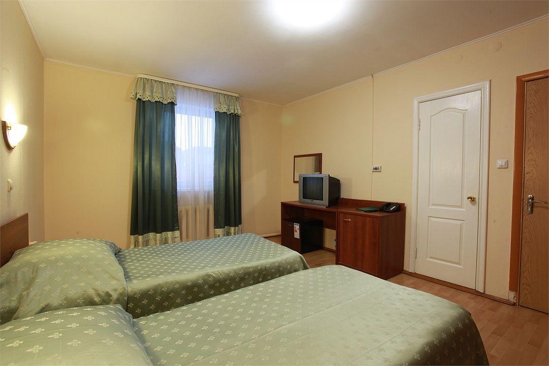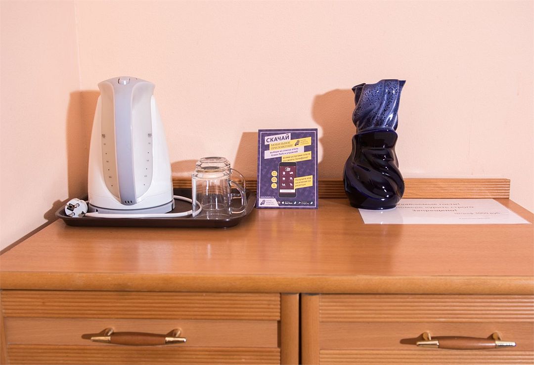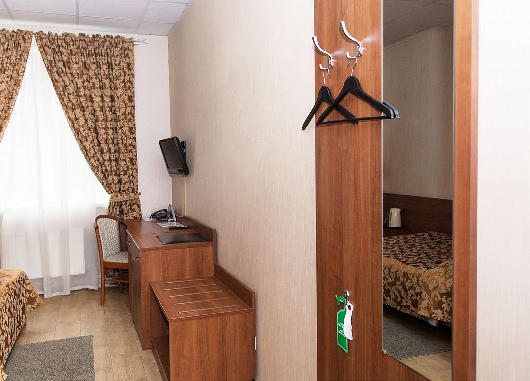 кабельное телевидение, Wi-Fi, фен, ванна, банные полотенца, тапочки, две односпальные кровати, тумбы, стулья, шкаф для одежды, вешалки, багажная тумба, зеркало, обслуживание номеров, чайник, унитаз, раковина, кулер на этаже, стаканы, столовые приборы, стол, внутренний телефон, мини-холодильник, можно с питомцамиВ гостиничном номере