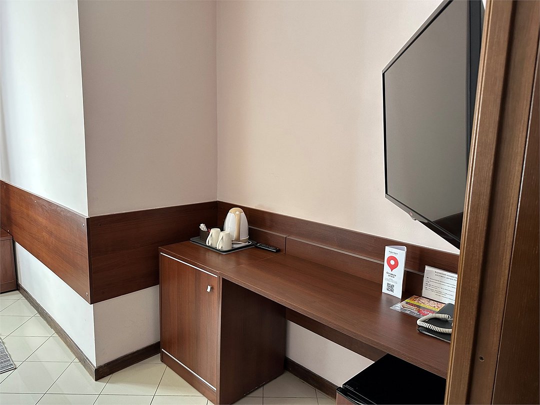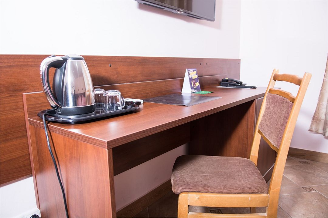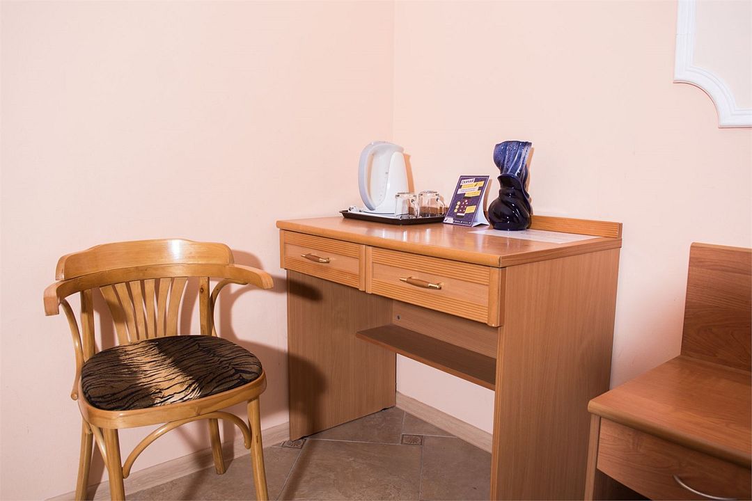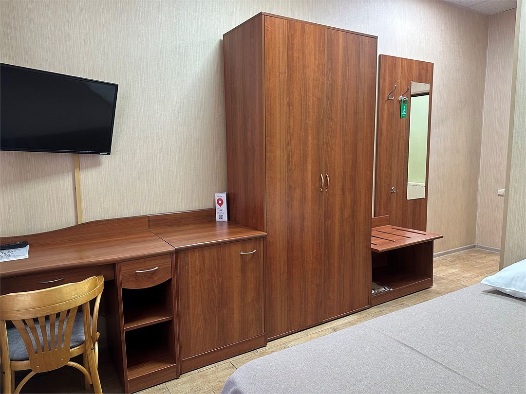 кабельное телевидение, Wi-Fi, фен, электронные замки, ванная комната, ванна, санузел, тапочки, односпальная кровать, шкаф для одежды, вешалки, письменный стол, багажная тумба, зеркало, обслуживание номеров, чайник, раковина, кулер на этаже, вид во двор, стаканы, столовые приборы, стул, тумба, туалетные средства, внутренний телефон, мини-холодильник, можно с питомцамиВ гостиничном номере