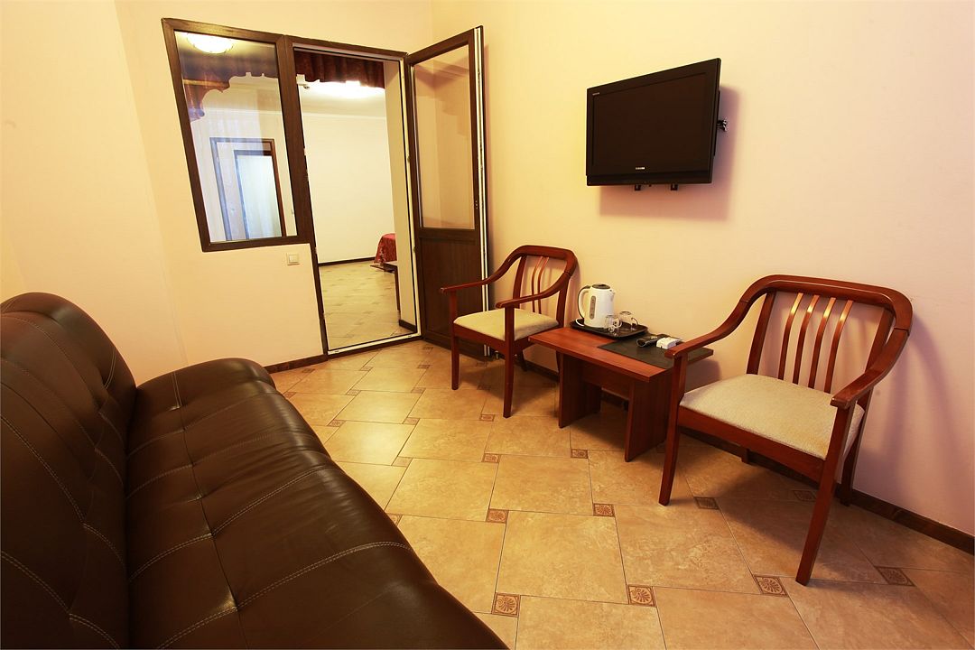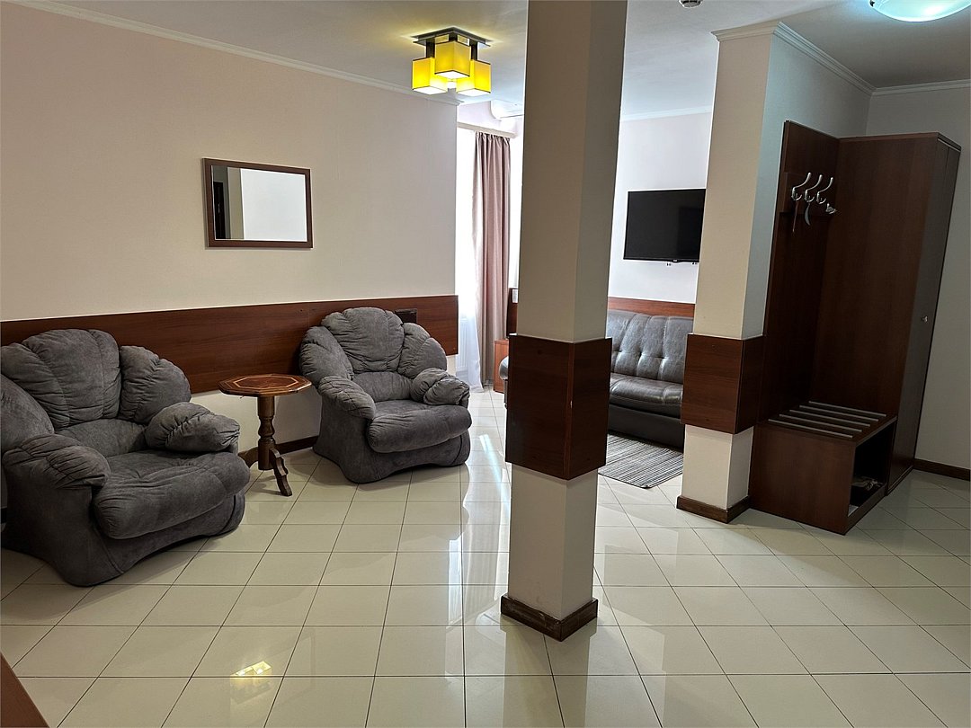 кабельное телевидение, Wi-Fi, кондиционер, светильник, фен, электронные замки, ванна, санузел, банные принадлежности, банные полотенца, тапочки, лоджия, диван, кресла, стулья, шкаф для одежды, вешалки, письменный стол, зеркало, две комнаты, чайник, унитаз, раковина, кулер на этаже, вид во двор, стаканы, столовые приборы, стул, стол, туалетные средства, туалет, вид на парк, раскладной диван, внутренний телефон, телевизор с плоским экраном, мини-холодильник, можно с питомцамиВ гостиничном номере