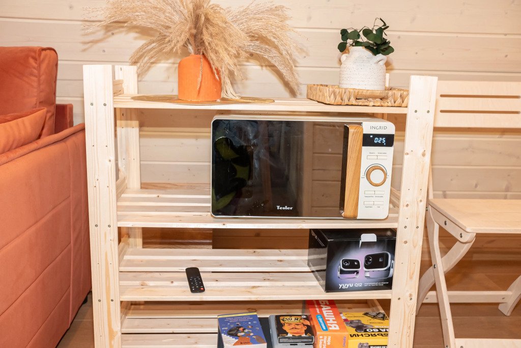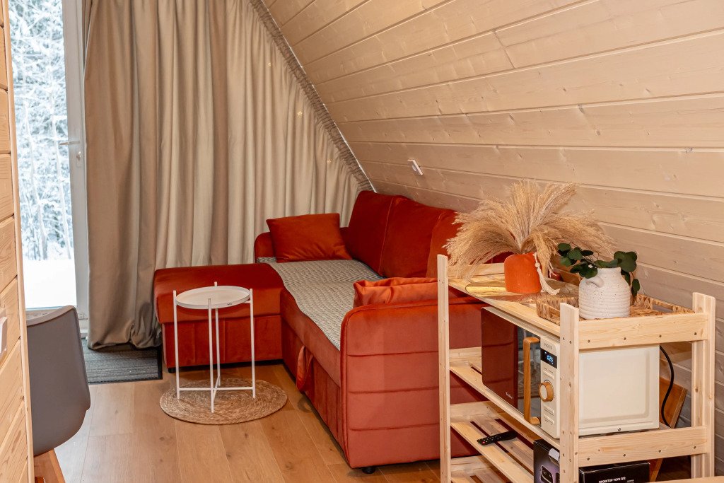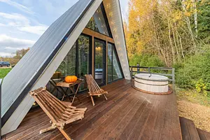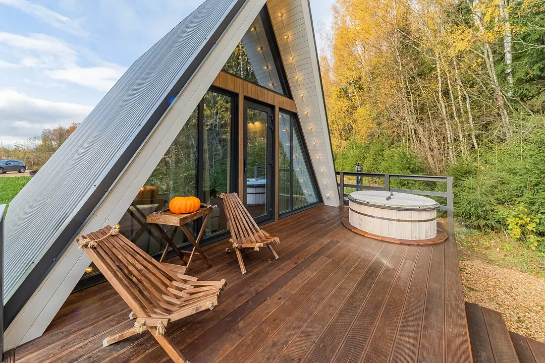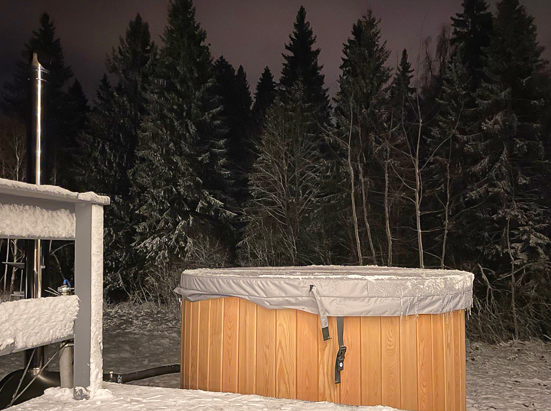 Гостям А-фрейма предлагается горячая купель на террасе у дома. Купель наполняется тёплой водой (t-35-45С).