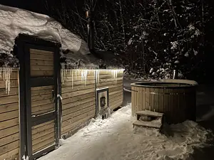 Инфраструктура: чанМинимальное время аренды: 3 часаДля гостей обоих домов доступна баня и большая купель на общей территории. Купель наполняется тёплой водой (t-35-45С). По запросу могут набрать холодную воду для сочетания с горячими банными процедурами.