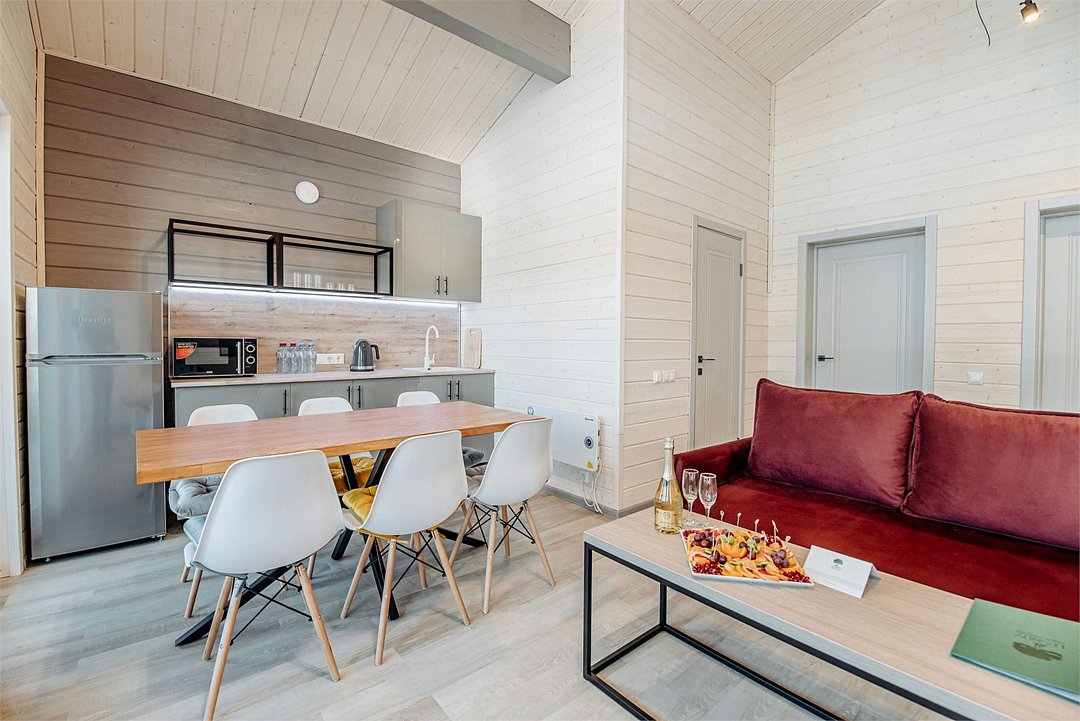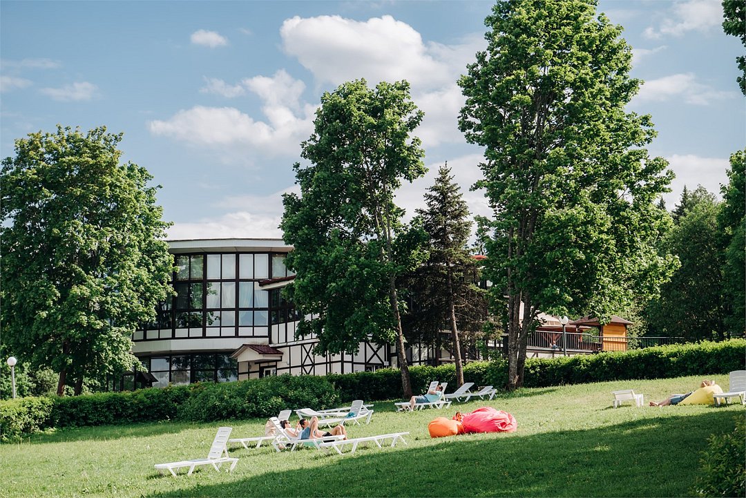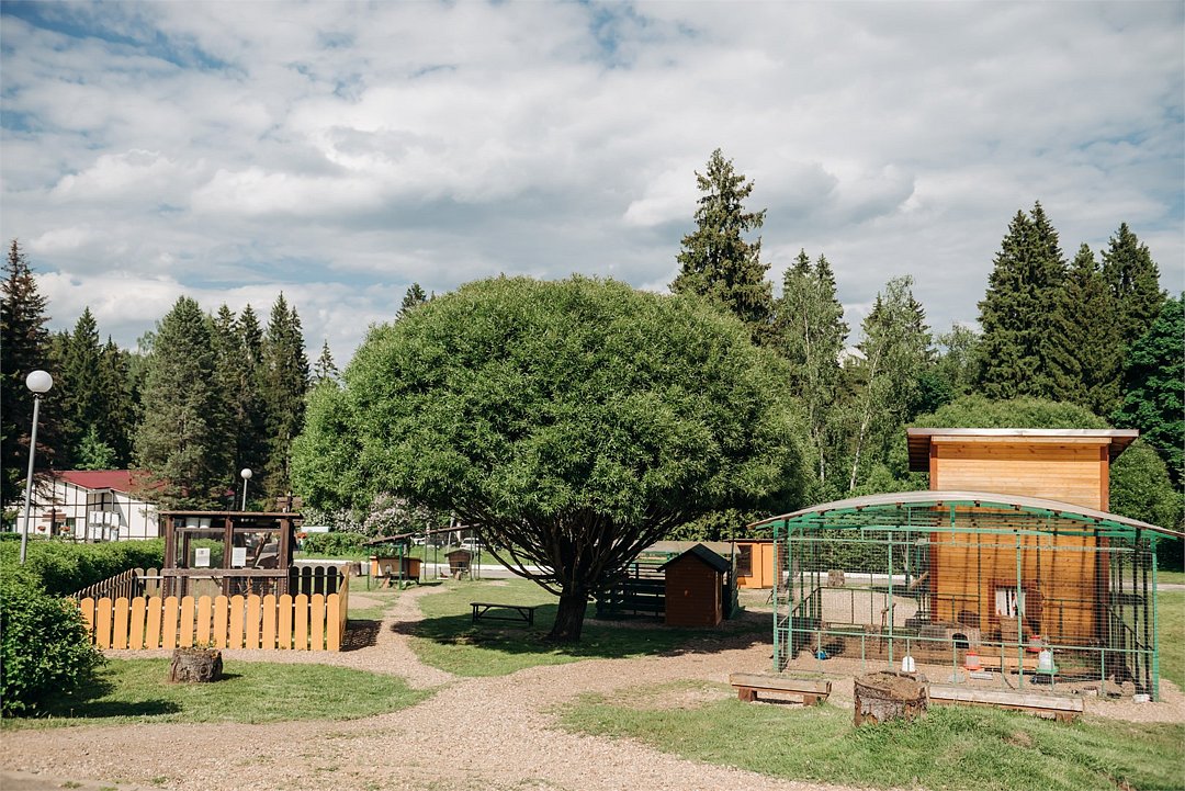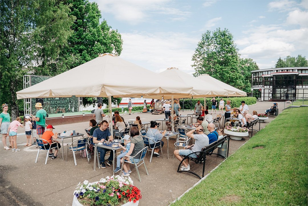 Путешествие с семьейХорошо в солнечную погодуМы отдыхали с 20.07 по 28.07. По приезду были слегка шокированы старой инфраструктурой территории, и хотели даже уехать, но дали себе шанс оценить отель после суток проживания. Мы отдыхали в супер новом коттедже и он прям супер классный и комфортный, что и было причиной остаться в этом отеле на неделю. Лес вокруг очень густой, воздух свежий. Уборка в коттедже качественная, водичку приносили, мы остались довольны) рядом с катеджами есть спорт площадки очень удобно утром ходить на тренировку на открытом воздухе, это конечно не полноценный спорт зал, но тренажеры позволяют привести тело и душу в тонус)) Так что каждое утро или днем можно потренироваться, поиграть в волейбол, мы в боччу еще играли. В ресторане не плохие интерьеры, еда очень простая, даже посредственная. Вкусно готовят блюда на открытом огне, мне показалось эти блюда достаточно вкусные все. Пирожные не ела, не хотелось, желе вкусное) компоты не пила, но слышала они сильно разбавленные. Кофе вполне можно пить, капучино неплохой, но и вкусным не назовешь. По вину, включенному с стоимость, выбора нет совсем 1 вид белого и 1 вид красного вина, которое наливается из бочки, качество среднее, но вот за деньги можно купить хорошие итальянские вина, рекомендую) Бассейн большой, но все требует ренновации. Сауна есть, их 2 супер маленького размера и нужно из бассейна спуститься по винтовой металлической лестнице чтобы в них попасть)) тот еще квест, особенно для крупных людей или высоких, можно ударится головой. Но пожив там недельку приноравливаешься и уже не представляет такого труда спускания и подьемы из бассейна в сауну и обратно. Конечно эту логистику нужно срочно менять и весь комплекс реконструировать. В прокате мы брали мяч, про остальное не знаю. Анимация есть только для малышей, есть что-то для взрослых, но активности не наблюдалось. Про зоопарк, он маленький и если встать в одном месте, то видишь всех животных, ходить никуда не надо, все на расстоянии практически вытянутой руки. Думаю для названия зоопарк это слишком громко, так «уголок живой природы». Важно еще сказать о том, что территория отеля небольшая и поднимается постоянно вверх, т.е. во время прогулки прям хорошая нагрузка на ноги) а это уж кому как нравится. Дискотеки были каждый день, кто любит танцевать и зажигать, точно понравится) мы даже были участниками интерактива на такой дискотеке, было весело нам понравилось. По итогу: если на улице солнышко можно отдыхать здесь, прогуливаясь, занимаясь спортом в окружении леса, если дождь, то заняться будет совсем нечем. Обратила внимание, что очень быстро убирают еду, если время закончилось, т е не просто ее не выносят, а прям секунда в секунду все убирают, не смотря на гостей, которые могут что-то еще пожелать взять. Для меня это странно, в отелях где я была просто перестают выносить и минут 10 у гостей есть возможность что-то взять при желании. А то получается надо прям с часами сидеть и следить. Ну это про сервис) Мы выстроив свою логистику по пребыванию в бассейне, ресторане чтобы было не много людей, отдыхали комфортно и возможно приедем еще. Веревочный городок Пешки парк очень понравился, рекомендую)