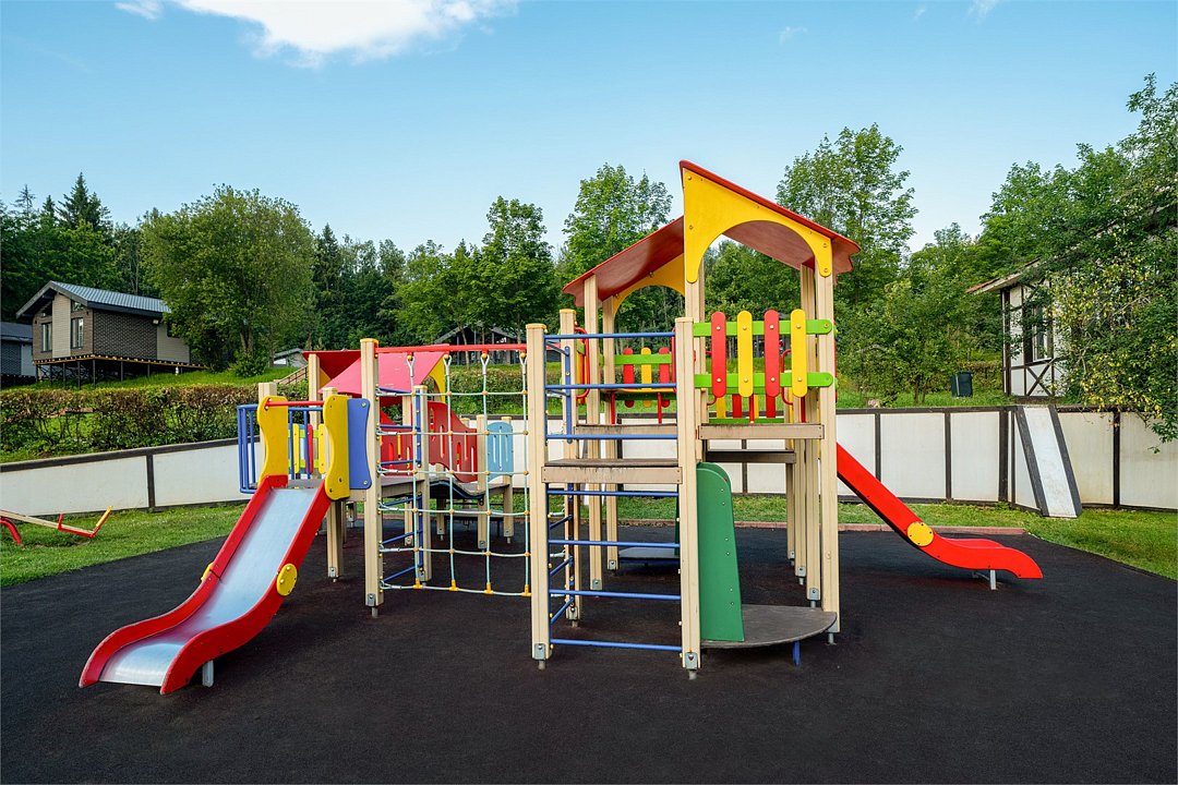 Детская площадка оборудована с учетом безопасности и развития детей всех возрастов. Площадка включает в себя разнообразные игровые элементы, такие как горки, качели и лазалки, которые не только развлекают, но и способствуют физическому развитию малышей.