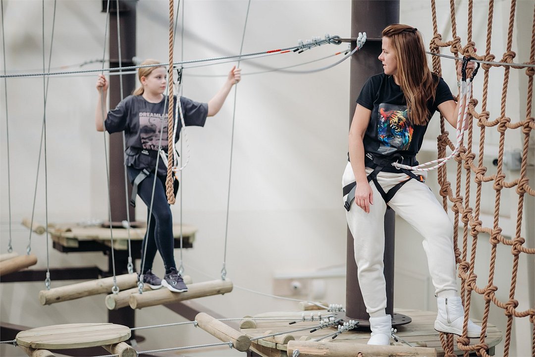 - Веревочный парк для активных дней (1 уровень — 7+ лет/от 120 см; 2-3 уровни — 13+ лет/от 140 см);