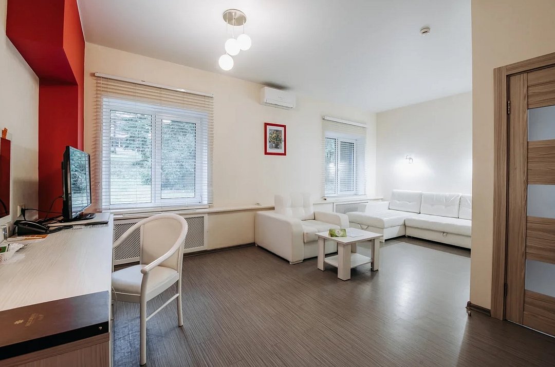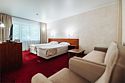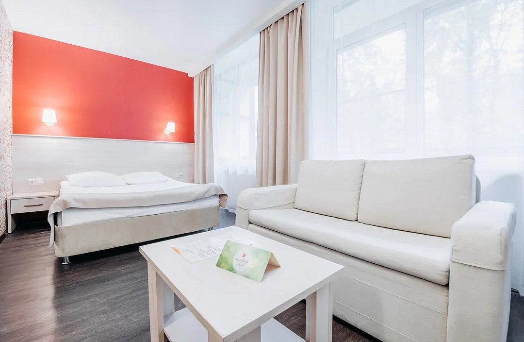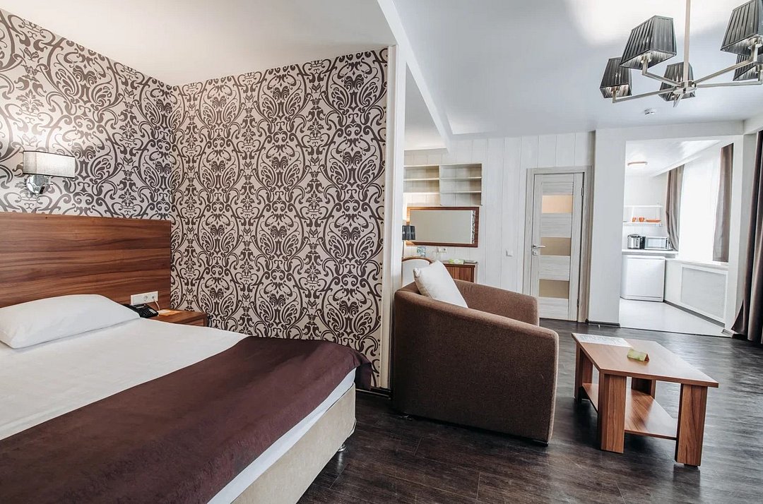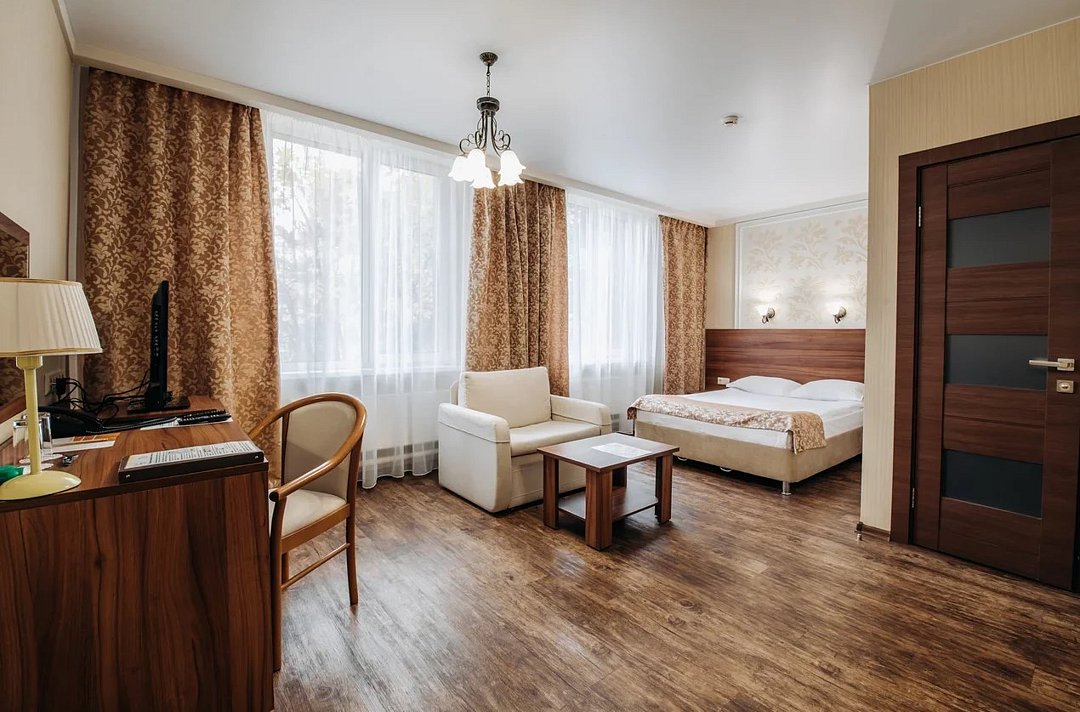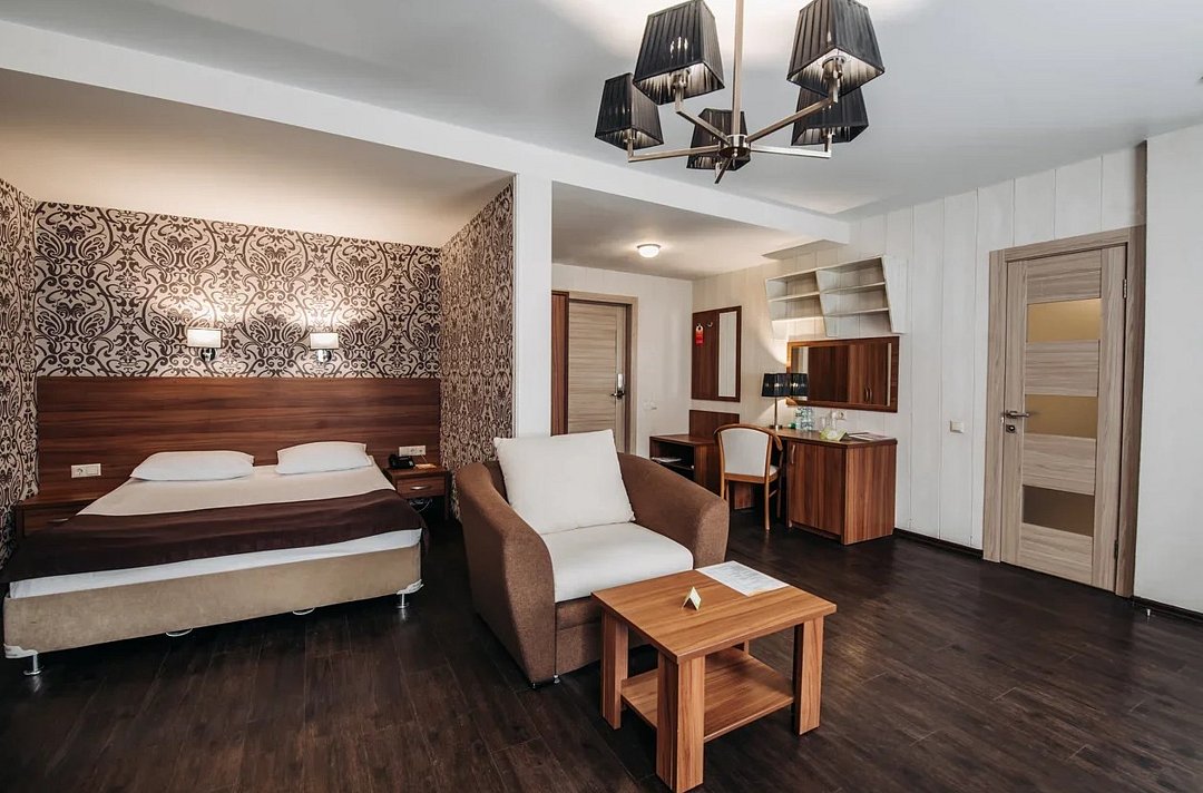 Люкс 1 комнатный площадью 26-29 кв.м. для комфортного размещения двух человек. В номере одна двуспальная кровать, небольшой диван и кресло. Возможна установка детской кроватки. Дети до 5 лет проживают бесплатно без предоставления дополнительных мест, не превышая максимально допустимое количество человек в номере.Услуги и удобства
