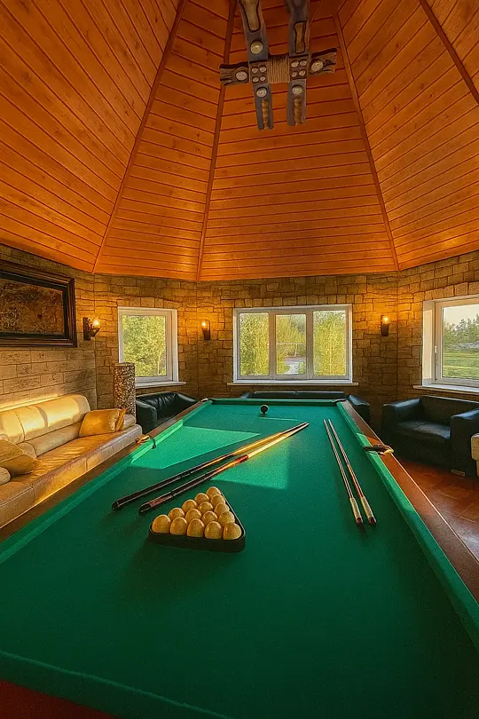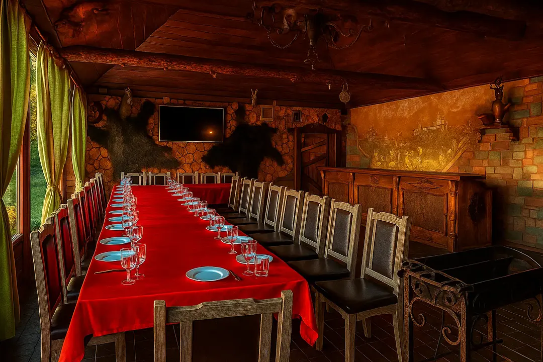 - просторный банкетный зал в стиле кантри и шале с панорамными окнами;