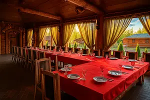 Особой гордостью является традиционная русская баня на дровах, которая подарит вам неповторимое ощущение гармонии души и тела. Для проведения мероприятий в аутентичном стиле оборудован банкетный зал с панорамными окнами.
