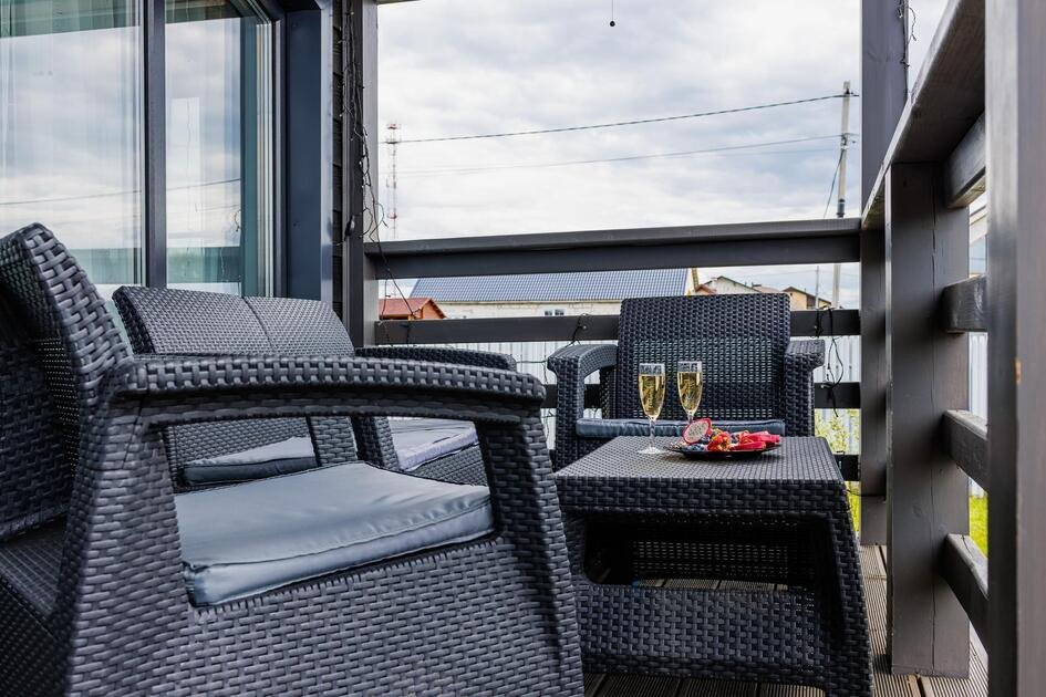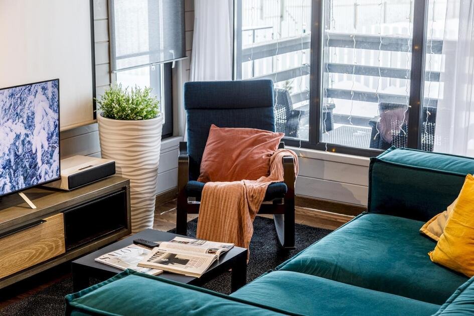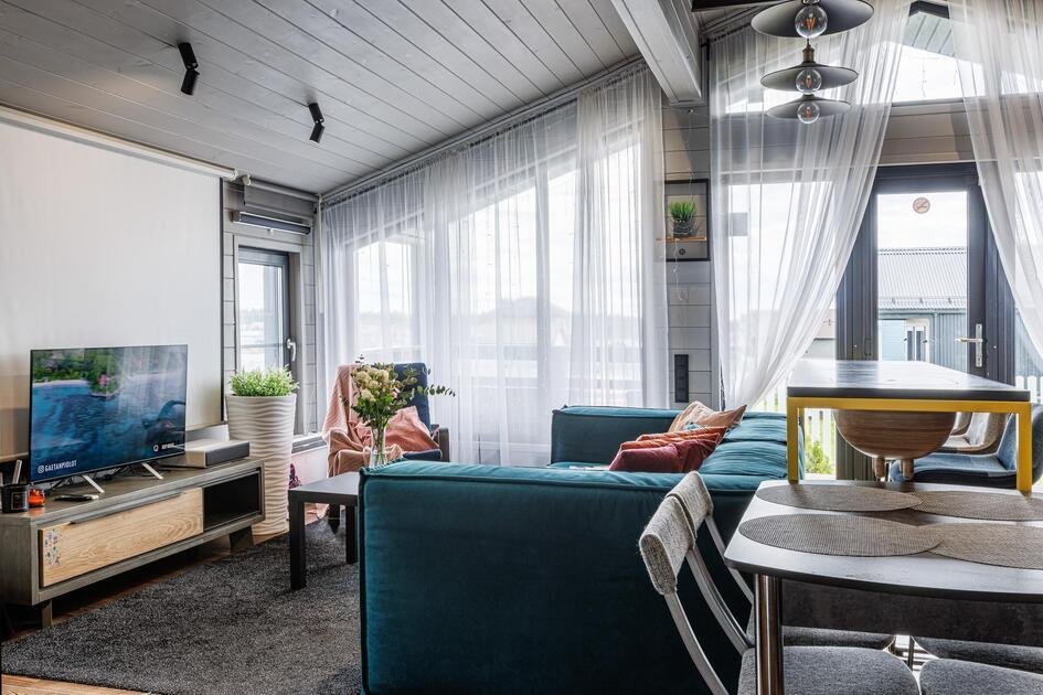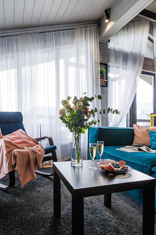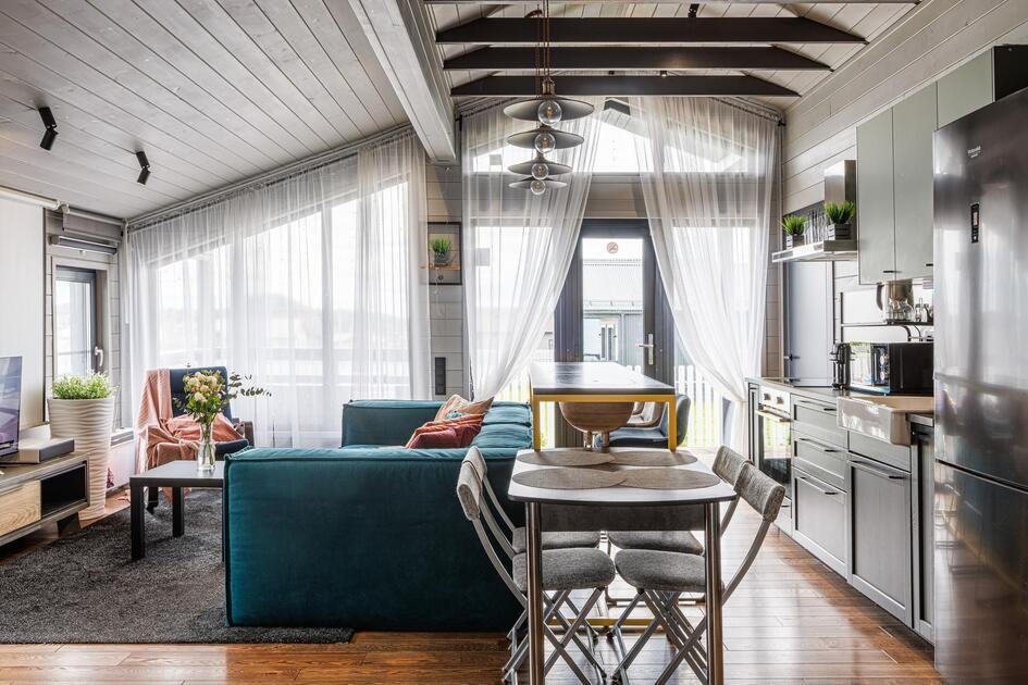 К услугам гостей две элегантные спальни и просторная кухня-гостиная, где можно отдохнуть на уютном диване-кровати. Для маленьких гостей предусмотрена отдельная детская комната с комфортным полутороспальным диваном. Два санузла и большая терраса добавляют комфорта.
