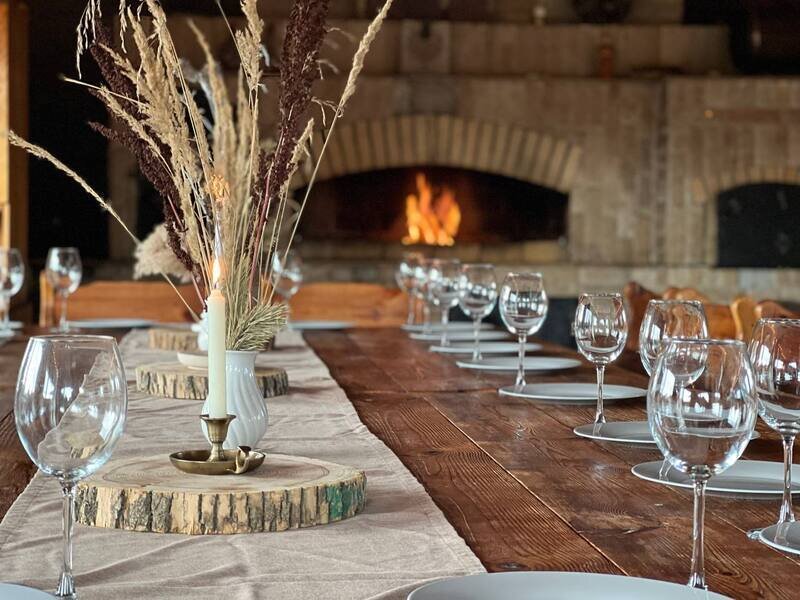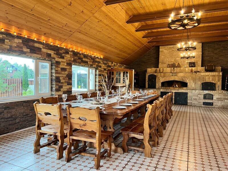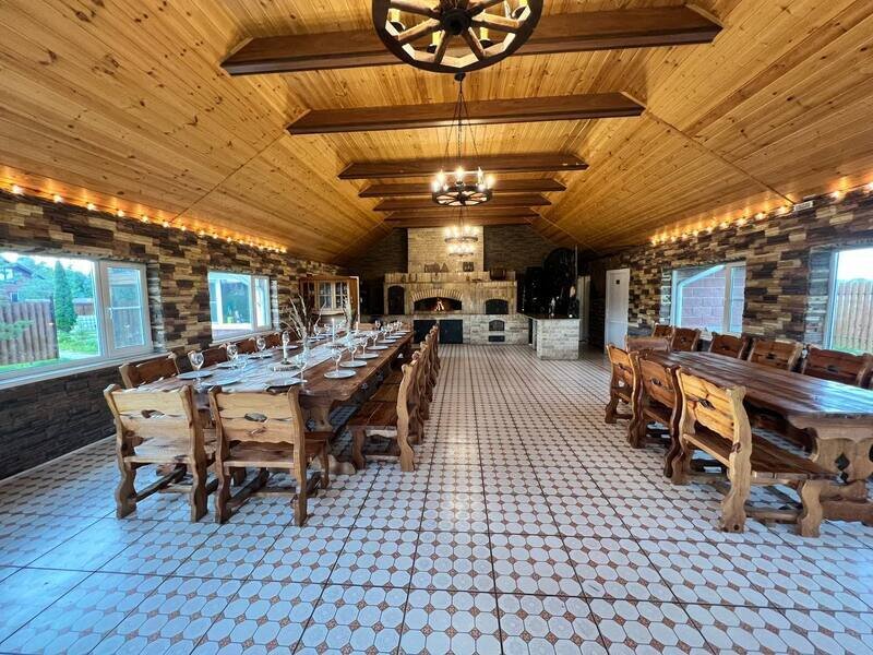 Читать полностьюУниверсальный зал для проведения различных мероприятий под названием «Беседка» рассчитан на 50 посадочных мест и оснащен всем необходимым для комфортного и незабываемого отдыха большой компанией. В «Беседке» расположены 5 массивных деревянных столов, каждый из которых может вместить от 8 до 10 человек. Расстановка мебели осуществляется в зависимости от количества гостей и формата мероприятия. Для создания уютной атмосферы в зале имеется полноценная акустическая система, подключаемая к различным устройствам. Дополняет интерьер камин, придающий особый шарм и тепло.