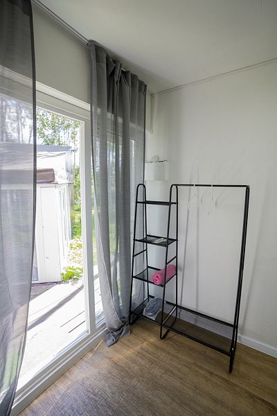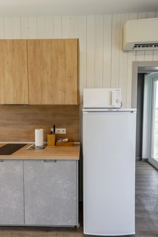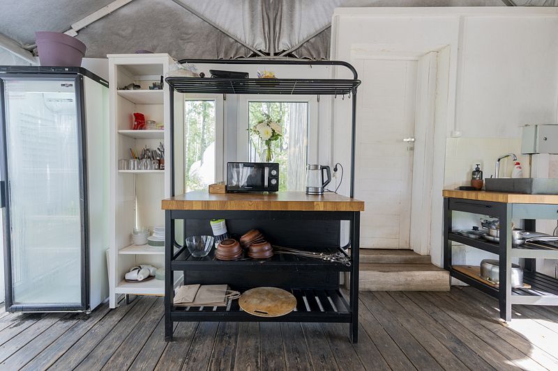 На веранде холодильник, чайник, микроволновка, вентилятор и печь, можно поставить