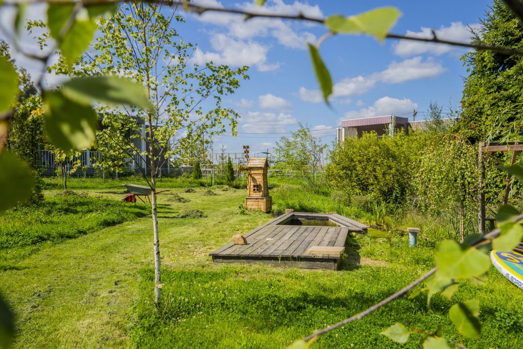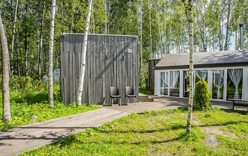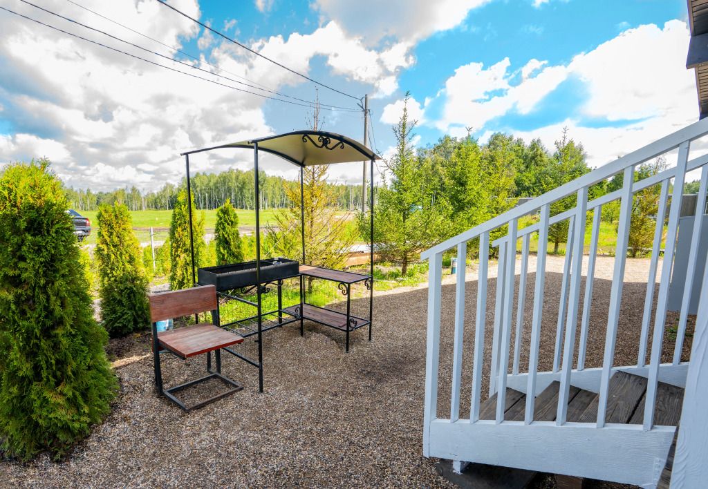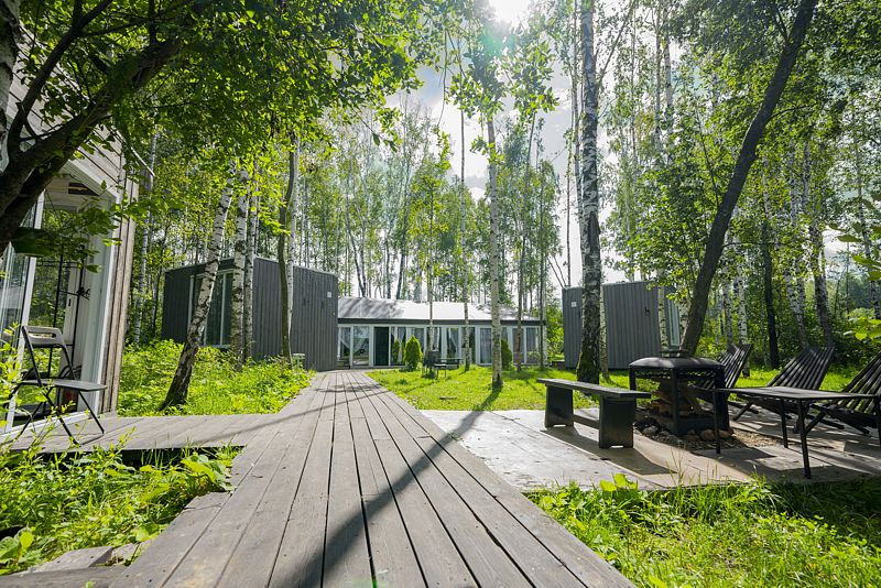 Рядом с домиками зона для барбекю с мангалом и костровая чаша.
