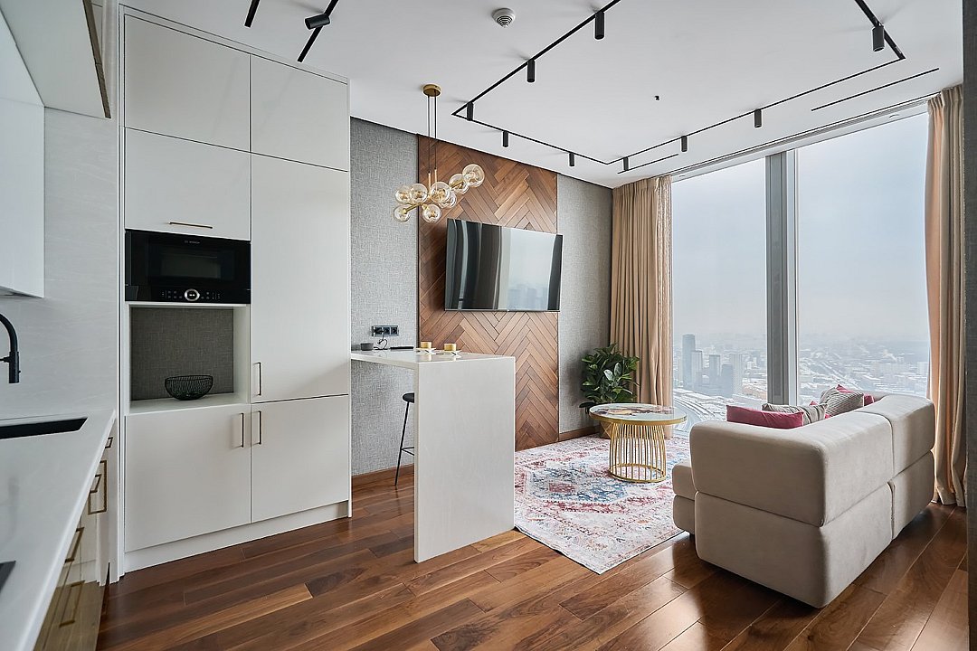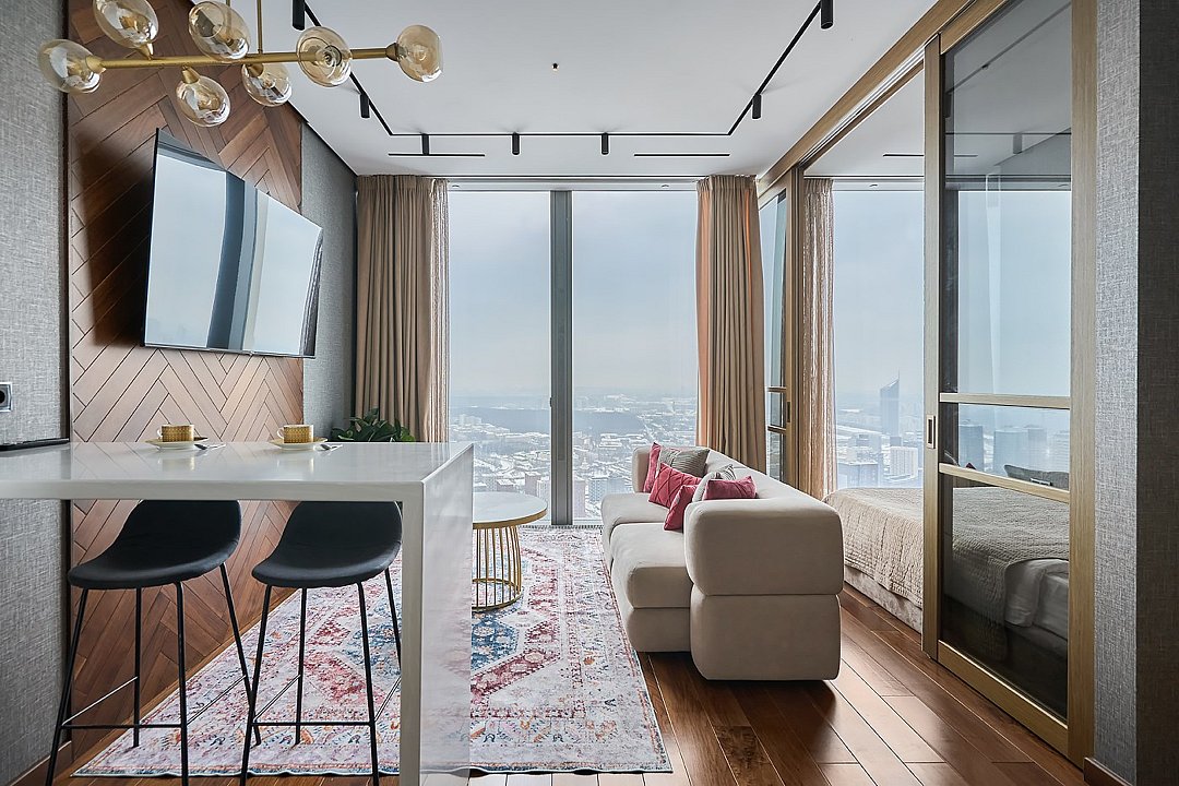 Апартаменты находятся в 95-этажном небоскребе, с окон которых открывается великолепная панорама на город. Комнаты просторные, светлые, оснащены современной комфортабельной мебелью. Для удобства гостей предусмотрены телевизор, кондиционер, гладильные принадлежности, стиральная машина, работает Wi-Fi. Санузел с душевой, отдыхающим предоставляются туалетные принадлежности, тапочки, полотенца. Кухонная зона оборудована холодильником, плитой, микроволновой печью, электрическим чайником, набором посуды и столовых приборов. Личный транспорт можно оставить на парковке возле дома. Для детей оборудована детская площадка.