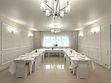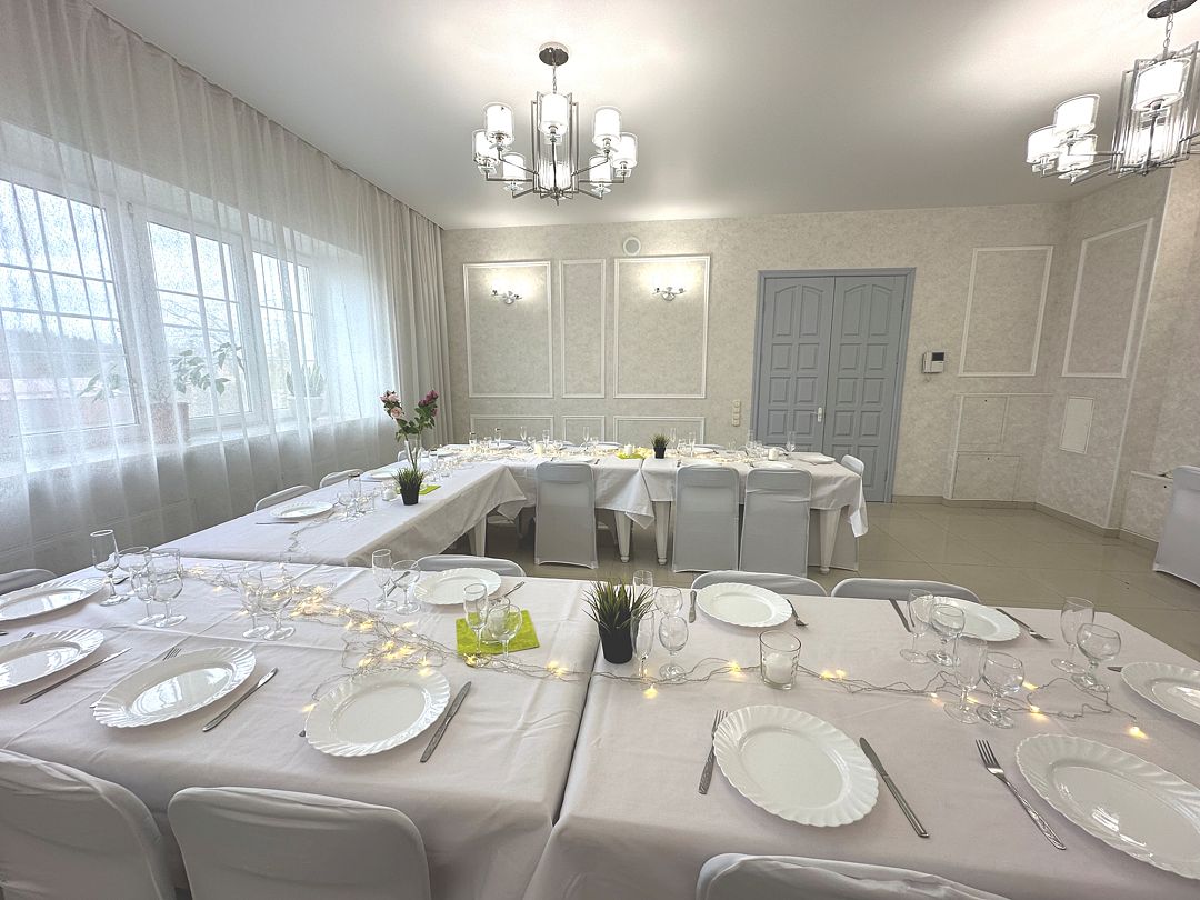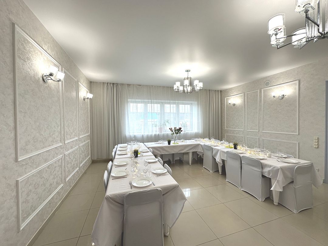 На втором этаже коттеджа находится элегантный банкетный зал, вмещающий до тридцати человек. Интерьер, оформленный в светлых оттенках, создает атмосферу уюта и торжественности для любых мероприятий.