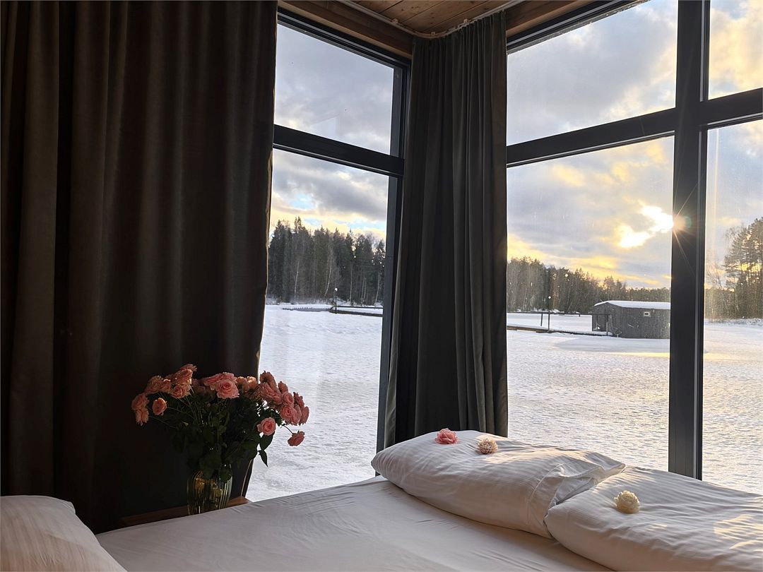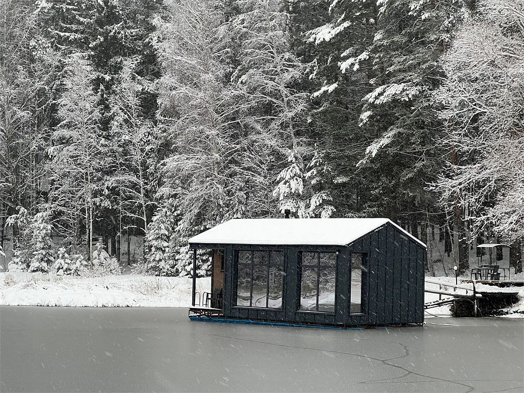 Уединённый домик «Селена» — идеальное место для отдыха вдвоём. Из панорамного окна открывается завораживающий вид на вековые сосны и гладь залива Истринского водохранилища.