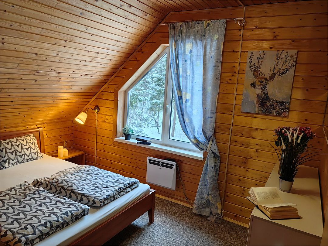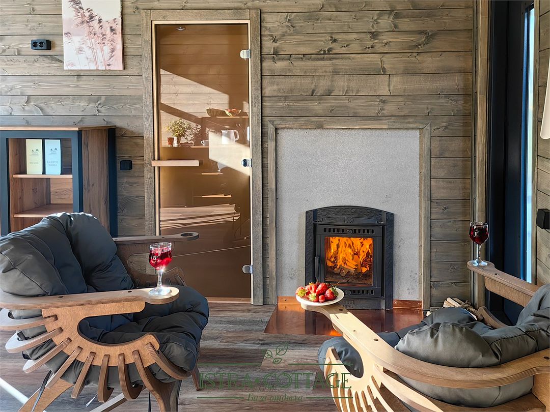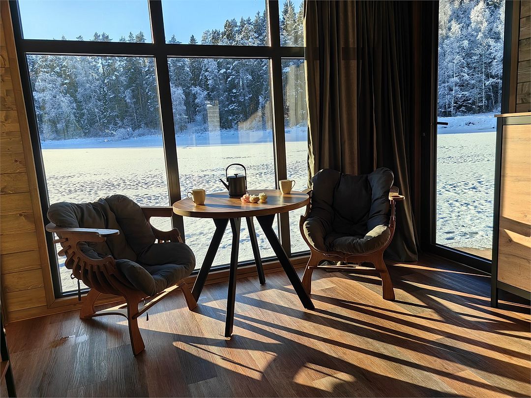 Двухкомнатный уютный домик «Гелиос» с камином. Панорамный вид на сосны и водохранилище, горячий чан с ароматными травами. Идеален для уединённого отдыха вдвоём.