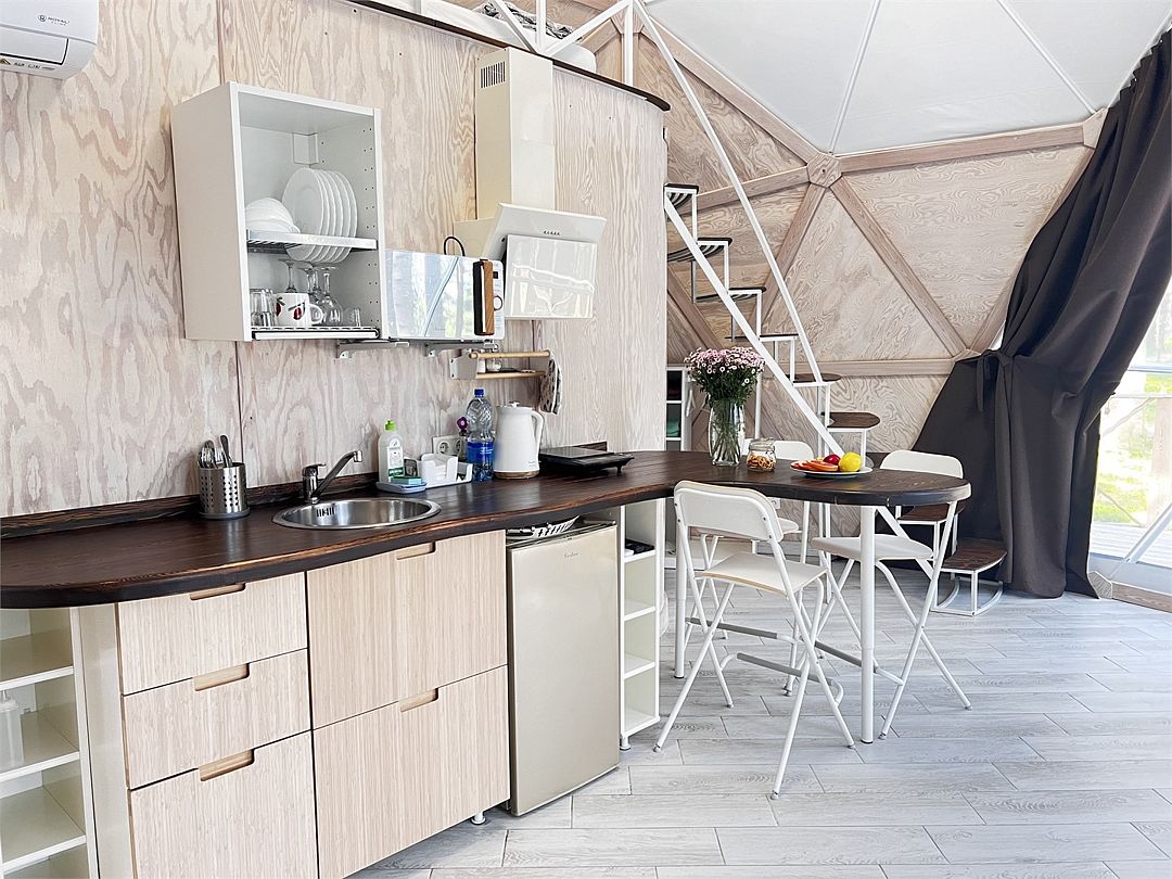 Уютный купольный дом «Астерия» — идеальное место для двоих. Из большого панорамного окна открывается живописный вид на сосновый бор и гладь Истринского водохранилища. Романтичности добавляет био-камин. Большая открытая терраса — отличное место для чаепития на свежем воздухе и любования красотами природы.