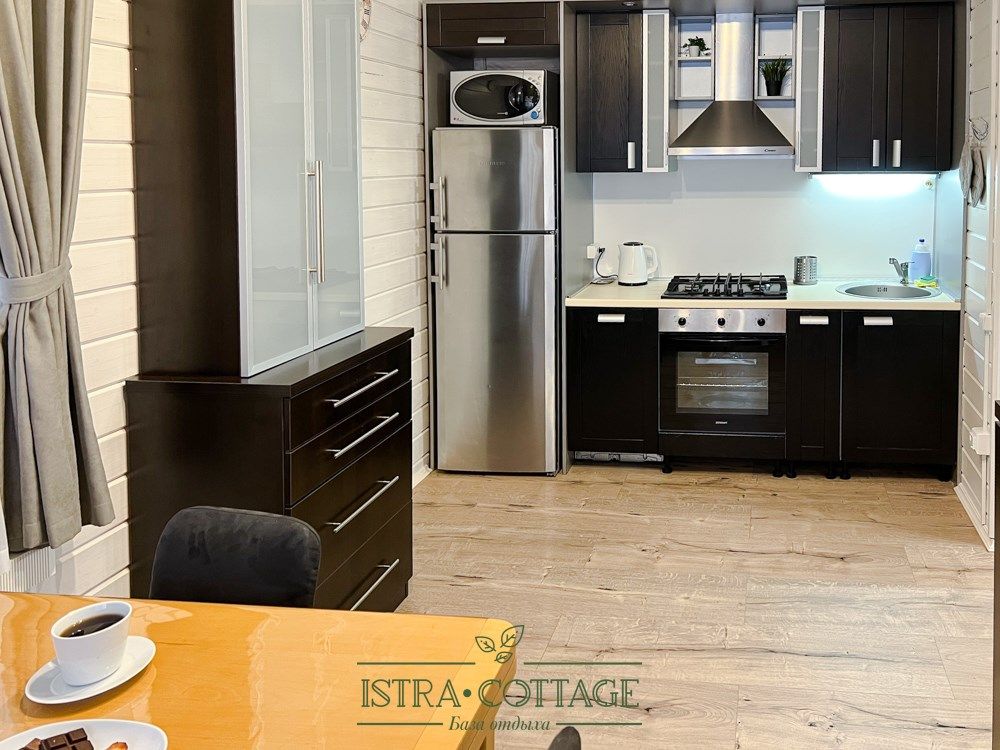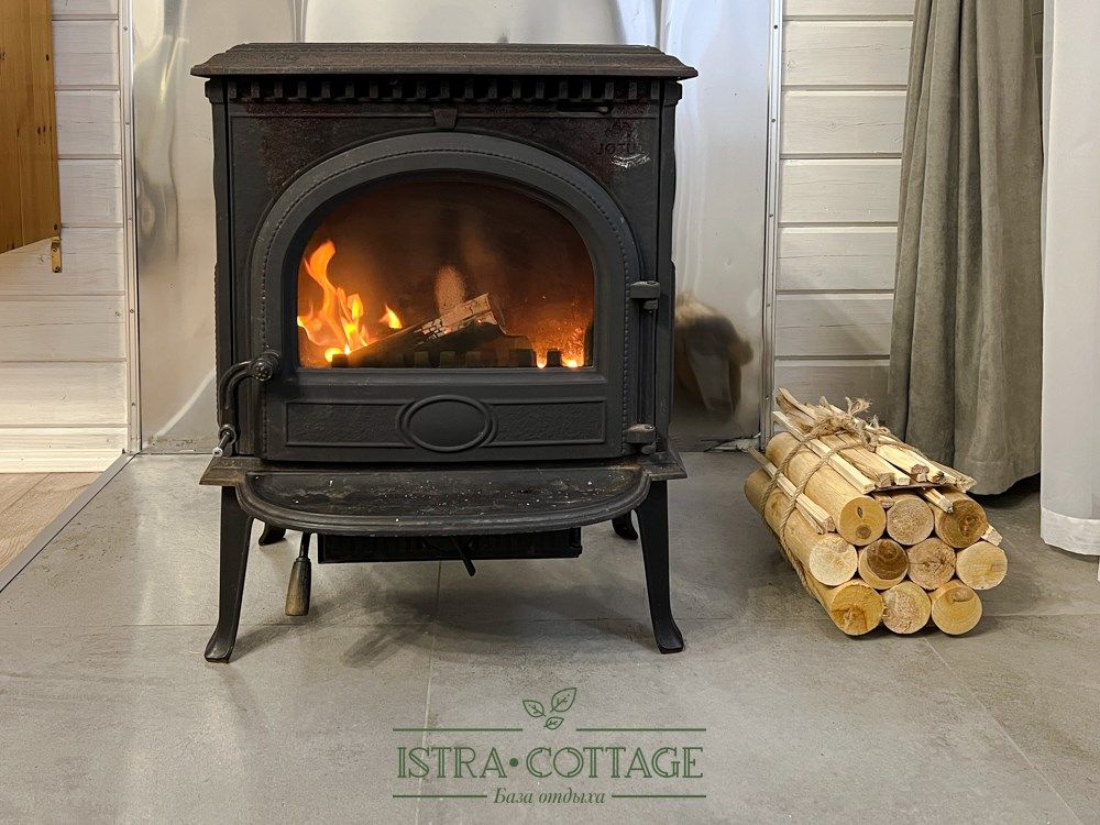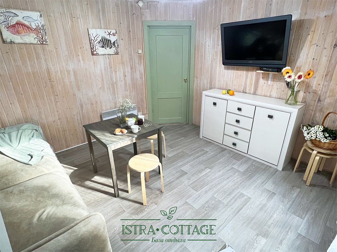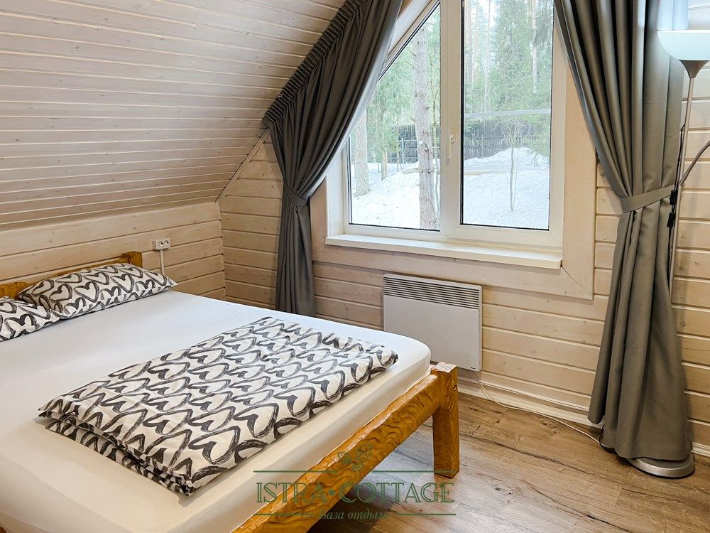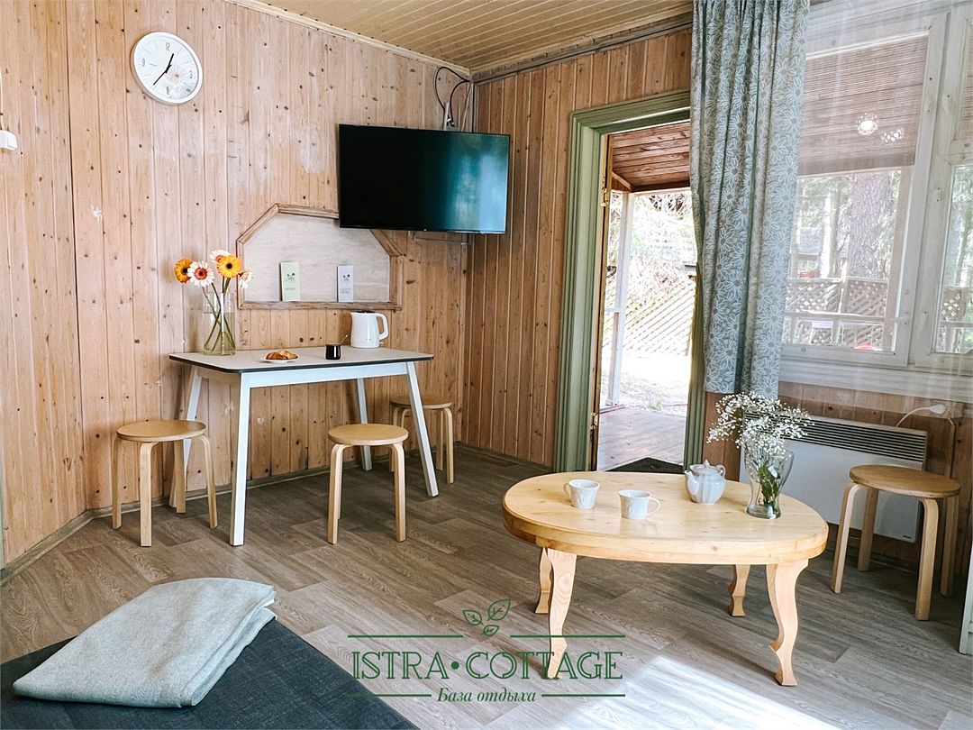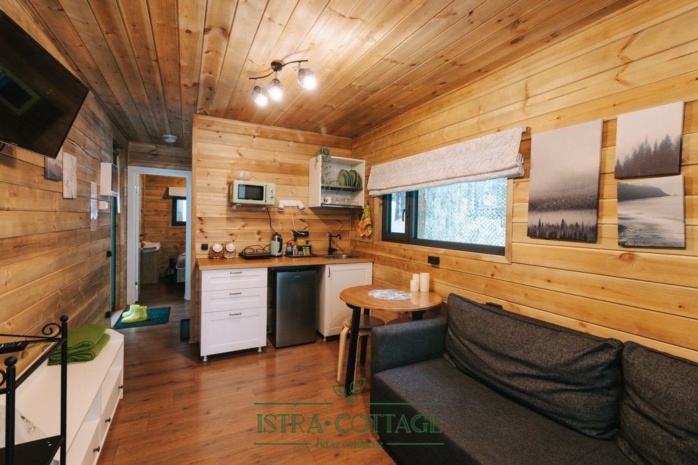 Уютный и комфортный дом с камином. Внутри: спальня, санузел и гостиная с панорамным окном. Мини-кухня с посудой, плитой, СВЧ-печью, чайником и холодильником. Тёплый пол, собственная мангальная зона. Из панорамного окна открывается вид на сосновый бор и Истринское водохранилище.