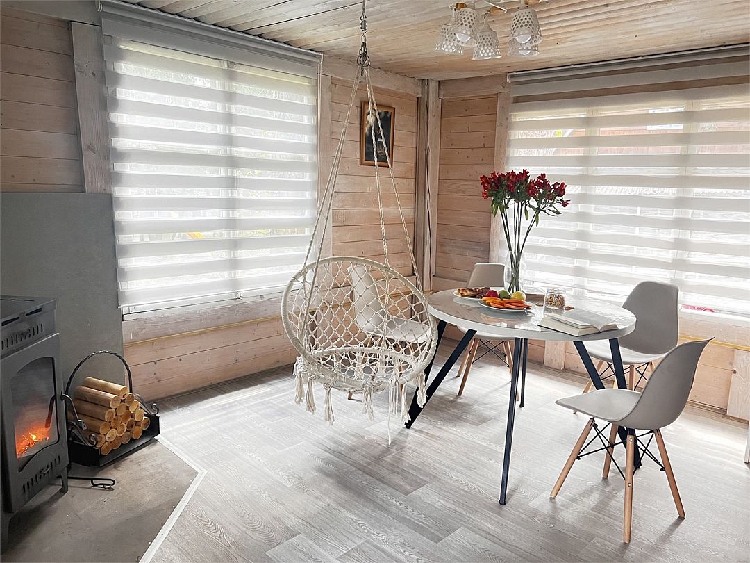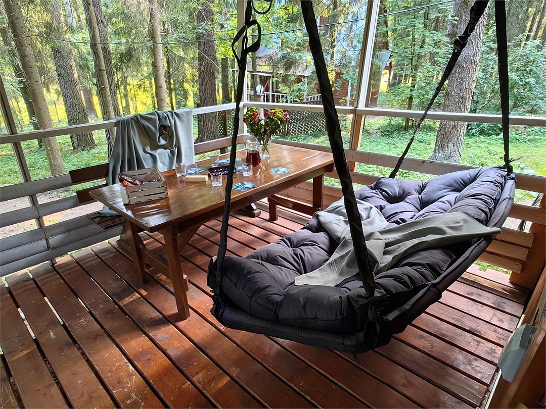 Первый этаж: комната с двуспальным диваном, односпальным диваном и телевизором; кухня; санузел (душ, унитаз, раковина); закрытая веранда с комплектом столовой мебели, камином и подвесными качелями.