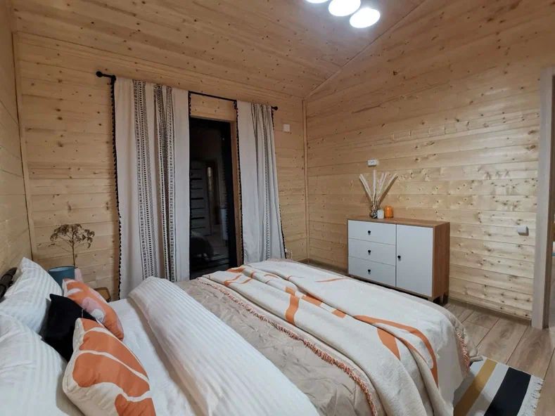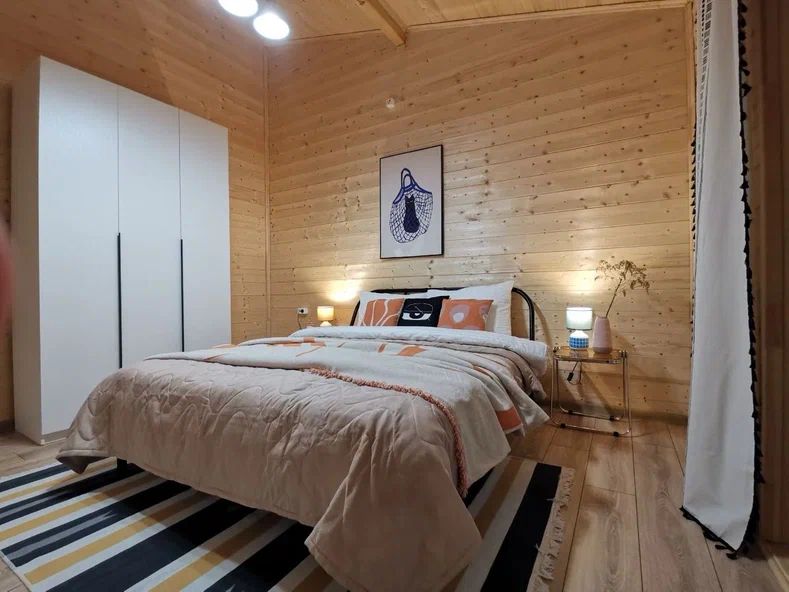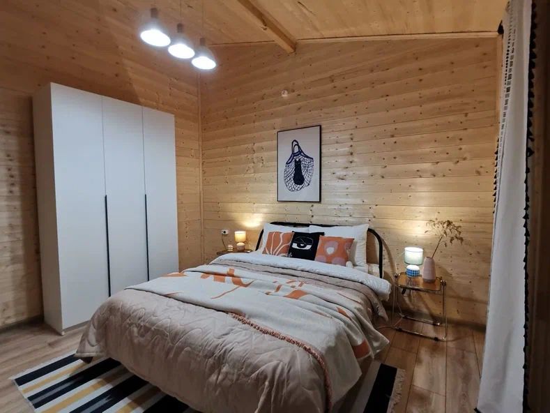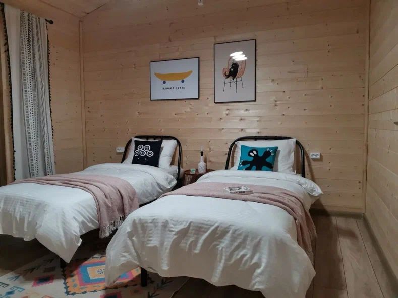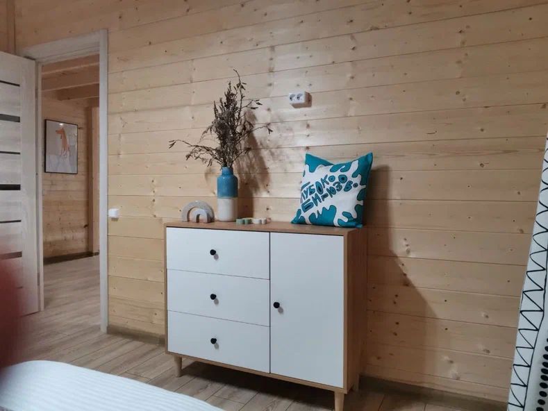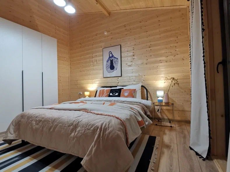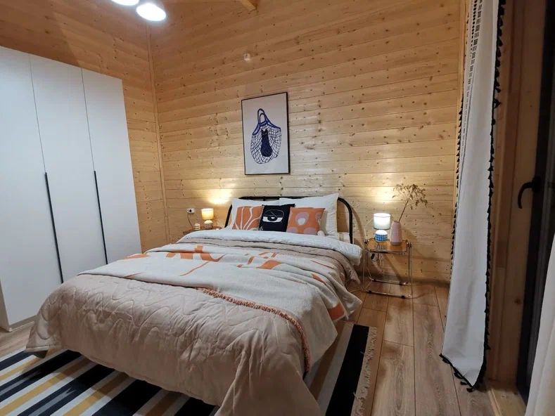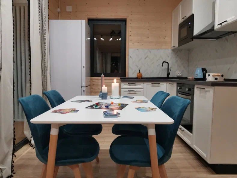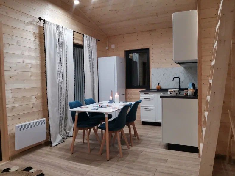 Внутри дома предусмотрены две односпальные кровати и одна двуспальная с ортопедическими матрасами для крепкого сна. В зале находится раскладной диван, подходящий для отдыха после активного дня. Кухня полностью оборудована всем необходимым для приготовления любимых блюд: варочной панелью, духовым шкафом и другой техникой. Посуда и столовые приборы на 6 персон предоставляются, а большой обеденный стол ждет для приятных бесед и угощений. На время отдыха доступен телевизор с онлайн кинотеатрами и настольные игры для всей семьи. Удобная душевая кабина в ванной комнате и необходимые средства личной гигиены обеспечивают комфорт.