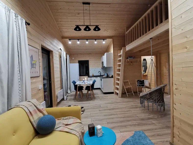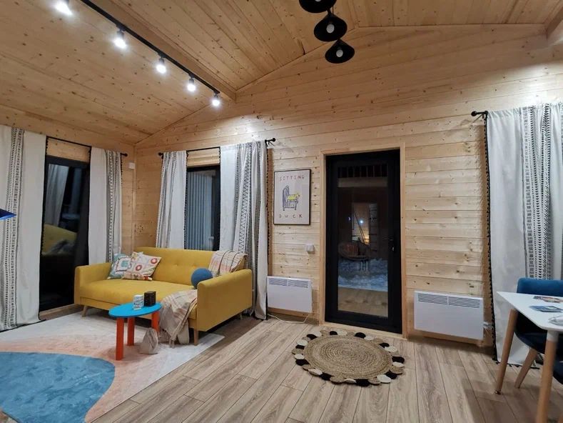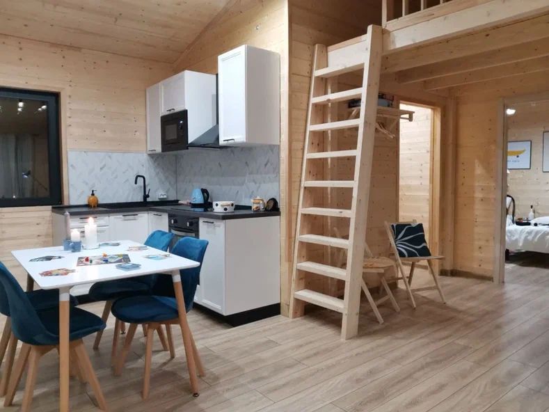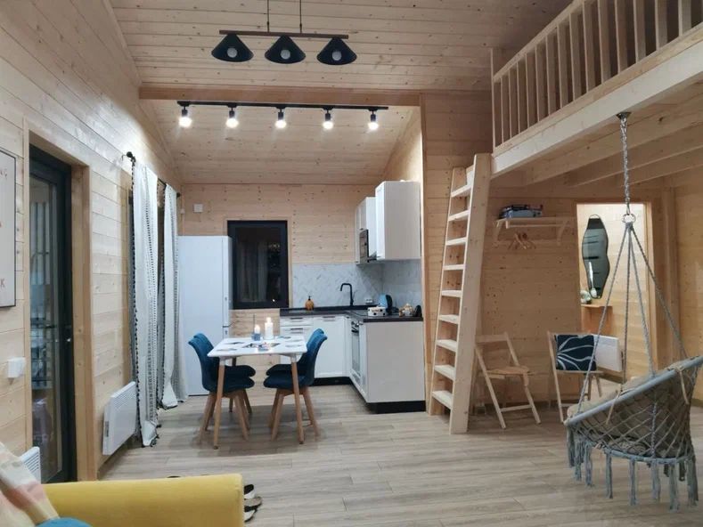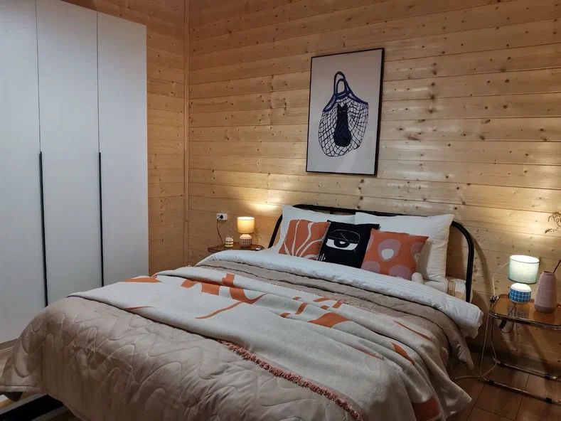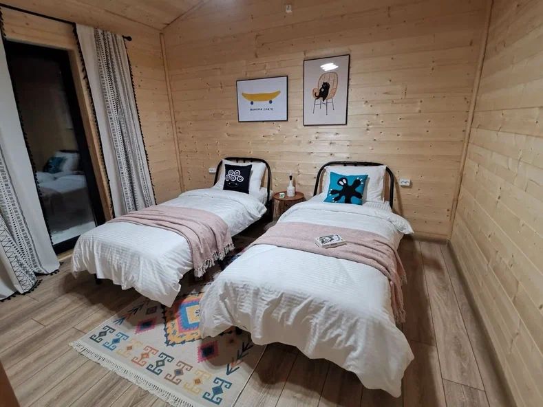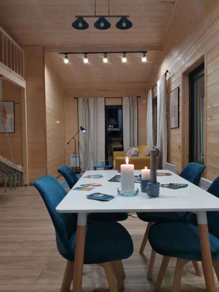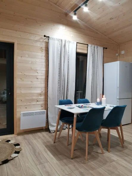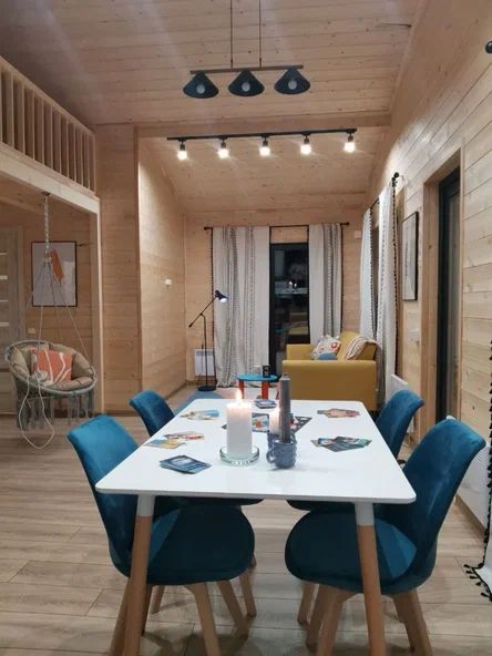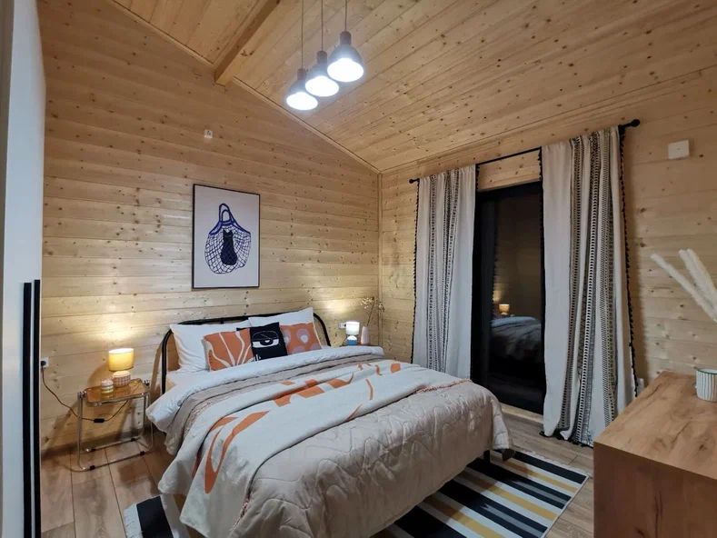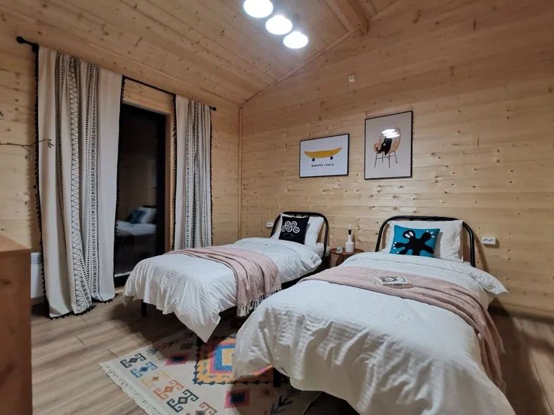 Внутри дома предусмотрены две односпальные кровати и одна двуспальная с ортопедическими матрасами для крепкого сна. В зале находится раскладной диван, подходящий для отдыха после активного дня. Кухня полностью оборудована всем необходимым для приготовления любимых блюд: варочной панелью, духовым шкафом и другой техникой. Посуда и столовые приборы на 6 персон предоставляются, а большой обеденный стол ждет для приятных бесед и угощений. На время отдыха доступен телевизор с онлайн кинотеатрами и настольные игры для всей семьи. Удобная душевая кабина в ванной комнате и необходимые средства личной гигиены обеспечивают комфорт.