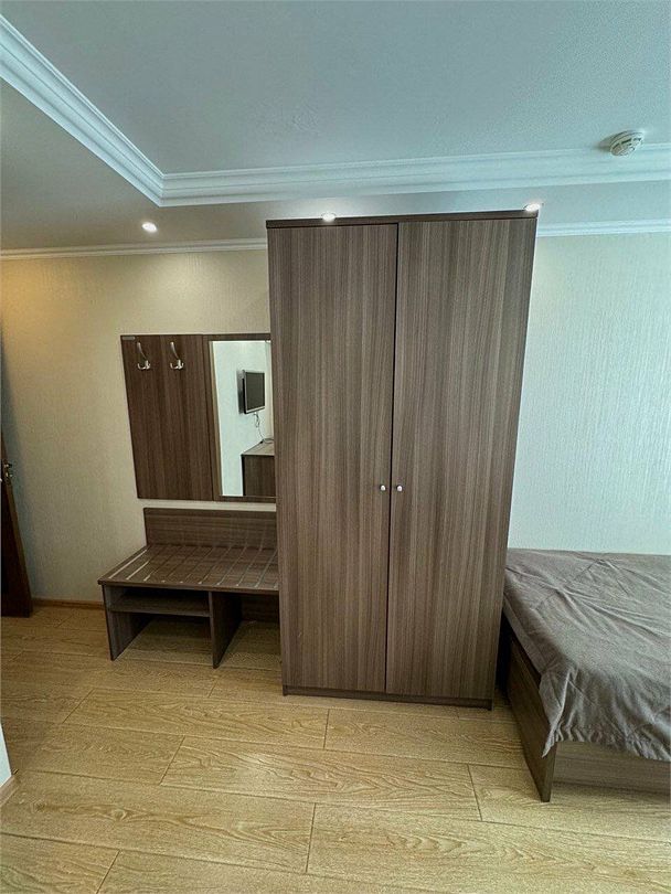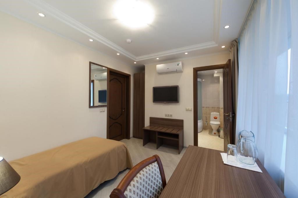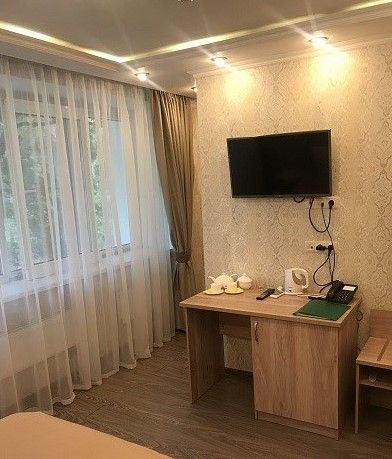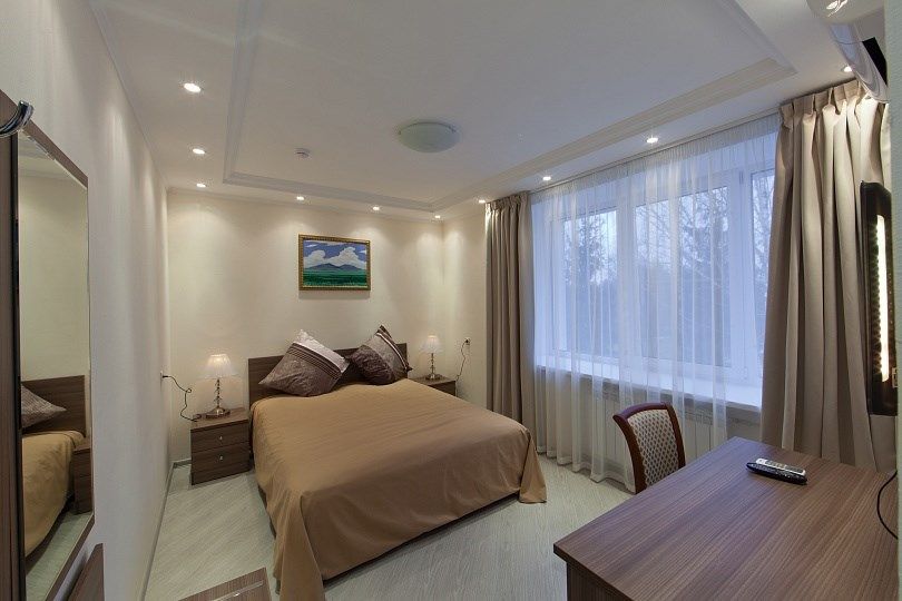 Двухместный однокомнатный номер. В номере: одна двуспальная кровать, тумбы, шкаф, стол, стул, кондиционер, телевизор, мини-холодильник, телефон, интернет, фен. Санузел оснащен душевой кабиной. Кулер на этаже.
