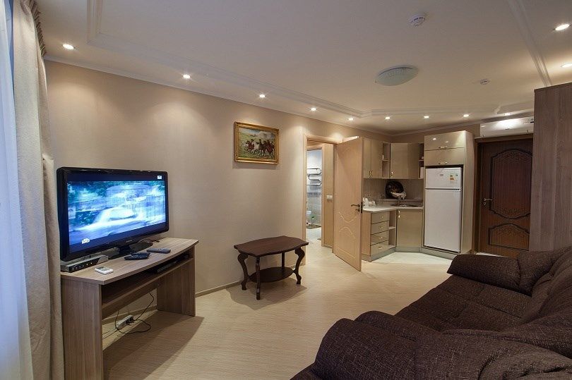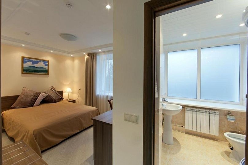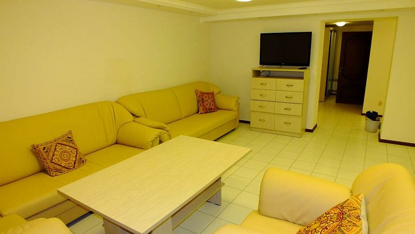 Двухместный двухкомнатный номер. В номере: двуспальная кровать, тумбы, диван, телевизор, телефон, интернет, кондиционер, утюг. Кухня: кухонный гарнитур, холодильник, электрический чайник, СВЧ-печь, посуда. Санузел оснащен душевой кабиной, феном. Кулер на этаже, настольные лампы.