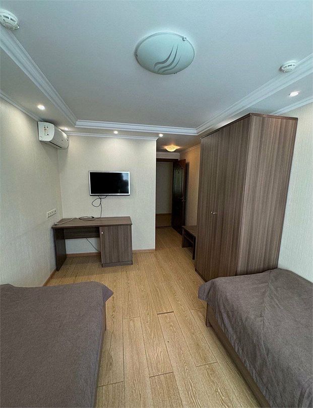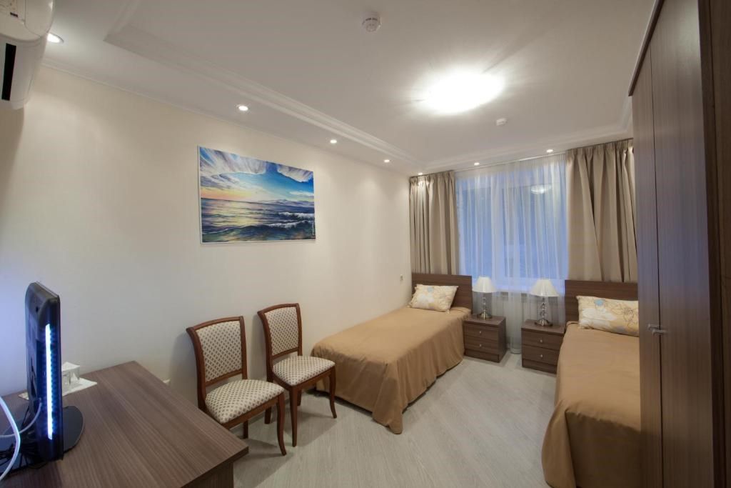 В номере: две односпальные кровати, тумбы, стул, шкаф, телевизор, мини-холодильник, телефон, кондиционер. Санузел оснащен душевой кабиной. Кулер на этаже.