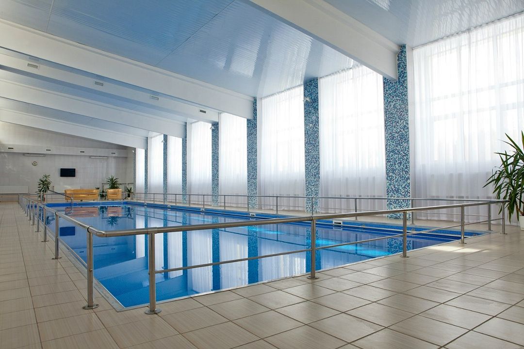 Тип бассейна: крытый бассейнРазмеры: 6 x 25 мПлощадь: 150 м²Глубина: 170 смОсобая гордость лечебно-оздоровительного комплекса — это бассейн с системой озонирования и ионизирования воды. Вода очищается без хлорирования, при помощи активного кислорода, что благотворно влияет на кожу и не вызывает аллергических реакций. Лечебное плавание в бассейне входит в состав водолечебных процедур. Полы в бассейне с системой подогрева. Бассейный комплекс находится в отдельном здании.