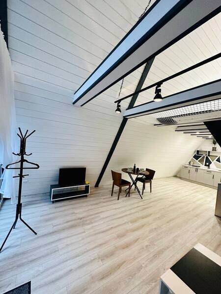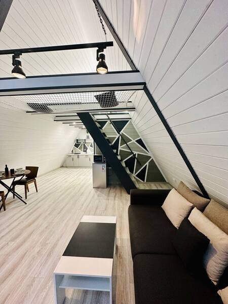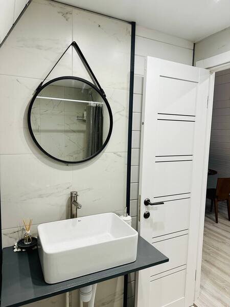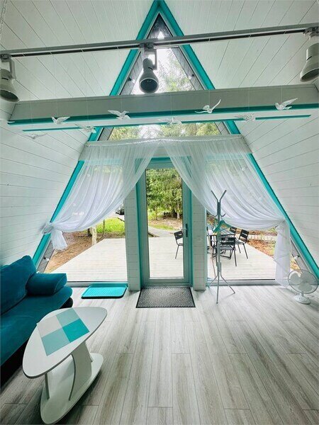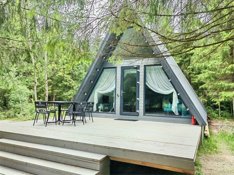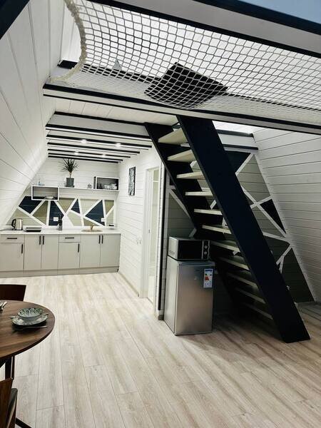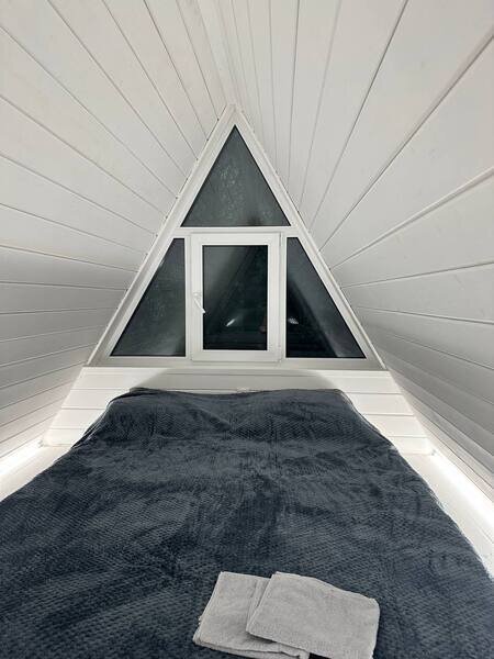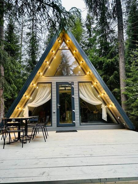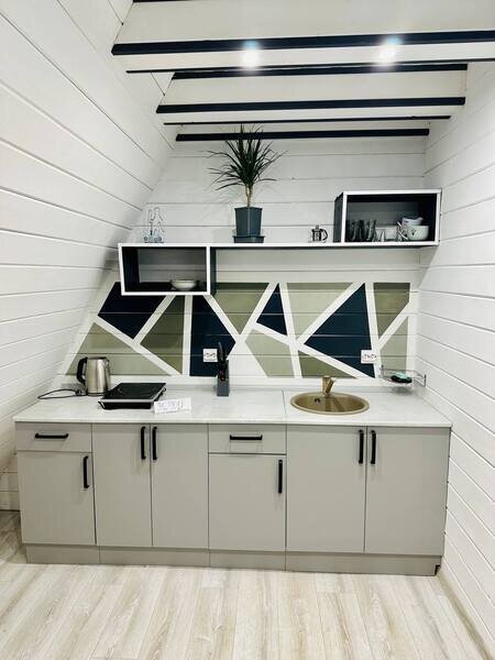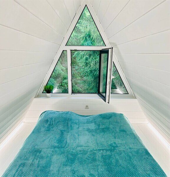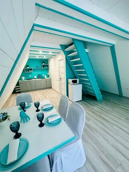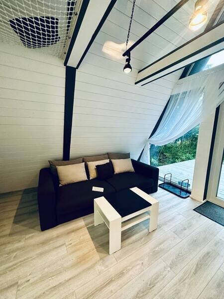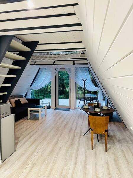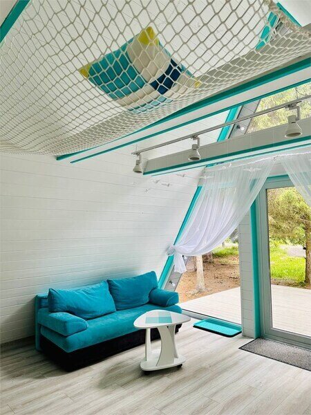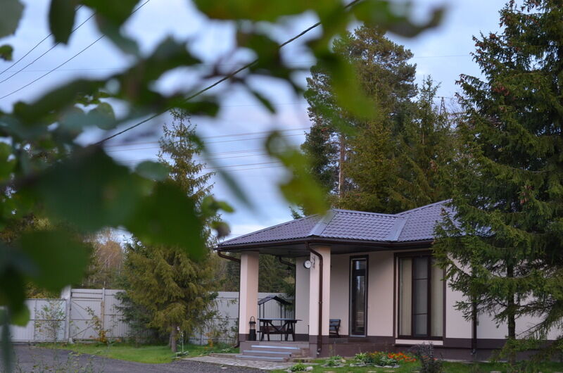 Коттедж Покров-1. Дом рассчитан на комфортное размещение 6-8 человек. Состоит из 3 закрытых спален с большими окнами в пол, из которых открывается восхитительный вид на деревья, большого гостиного зала, объединённого с кухней. Один общий санузел с душевой кабиной.